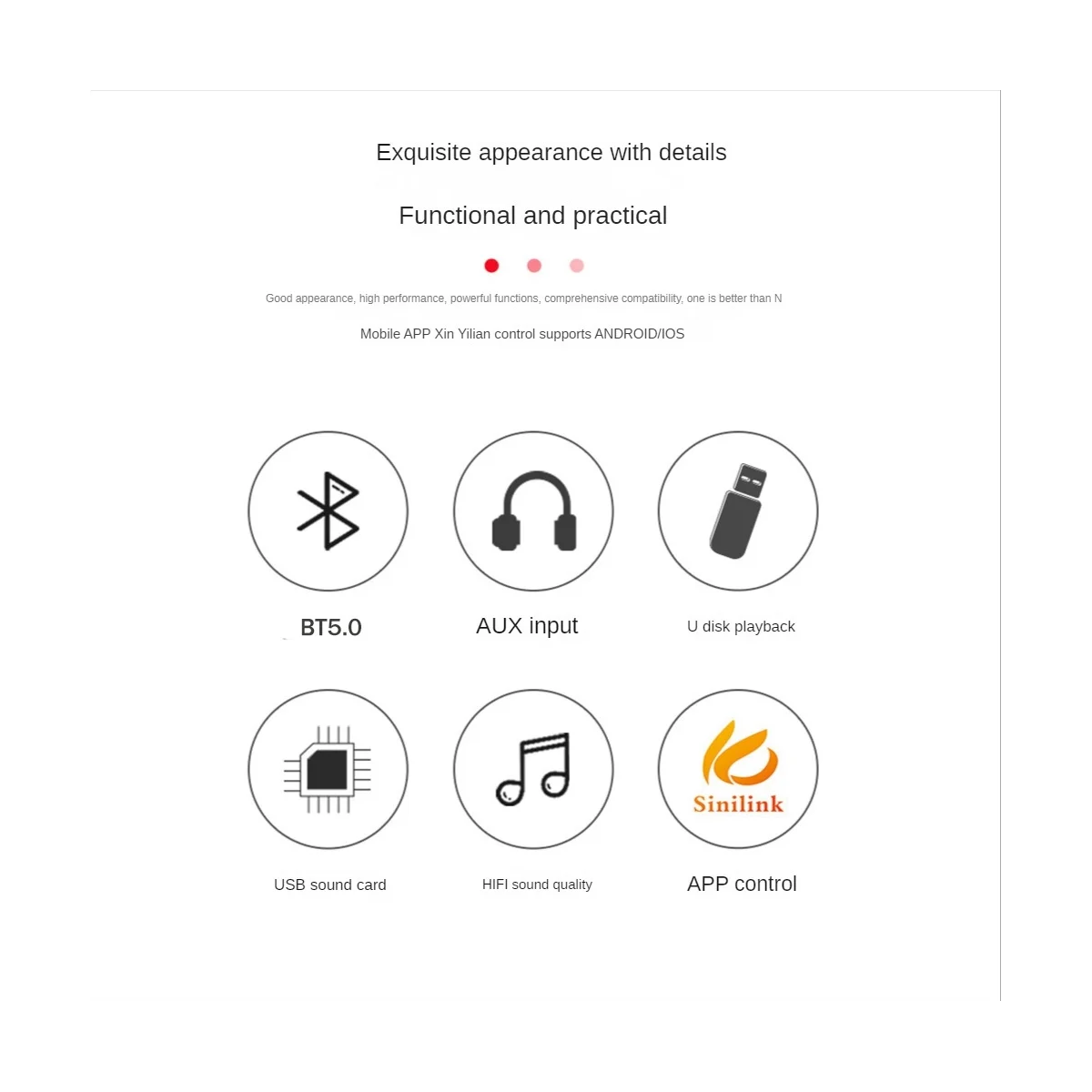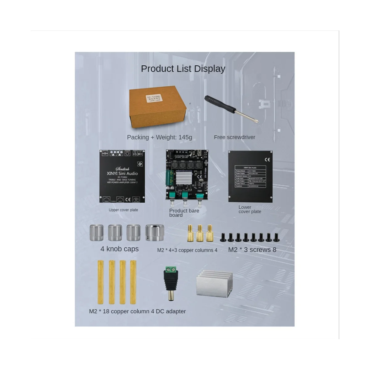 Modelo del producto: 100W + 100W Nombre del producto: 5,0 W + W placa amplificadora de potencia Bluetooth estéreo ajustable de graves altos fuente de alimentación: 1/versión Bluetooth 10A o superior: entrada de Audio: bluetooth + AUX + memoria USB + tarjeta de sonido USB Salida de audio: altavoz pasivo + salida estéreo de interfaz de 3,5mm Ajuste de volumen: Ajuste de la perilla del codificador de gama alta, sensación suave Rango de frecuencia: relación señal-ruido 20Hz-30KHz: Bocina adaptada de 92dB: 20W-200W/2 Ω - 8 Ω Potencia de salida: 100W * 2 Mecanismo de protección: protección estática, protección contra sobrecalentamiento, protección contra sobrecorriente, protección contra cortocircuitos Función especial: soporte Sinilink-APP control Tamaño del producto: 98mm x 70mm x 25mm Material: PCB + metal color: negro Contenido del paquete: 1 Placa amplificadora de potencia 1 Placa de cubierta superior e inferior 1 paquete de tornillos 1 Adaptador de CC 1 destornillador 1 disipador de calor Solo el contenido del paquete anterior, otros productos no están incluidos. Nota: El reflejo de la luz y las diferentes pantallas pueden hacer que el color del elemento en la imagen sea un poco diferente del real. El error de medición permitido es +/- 1-3cm.