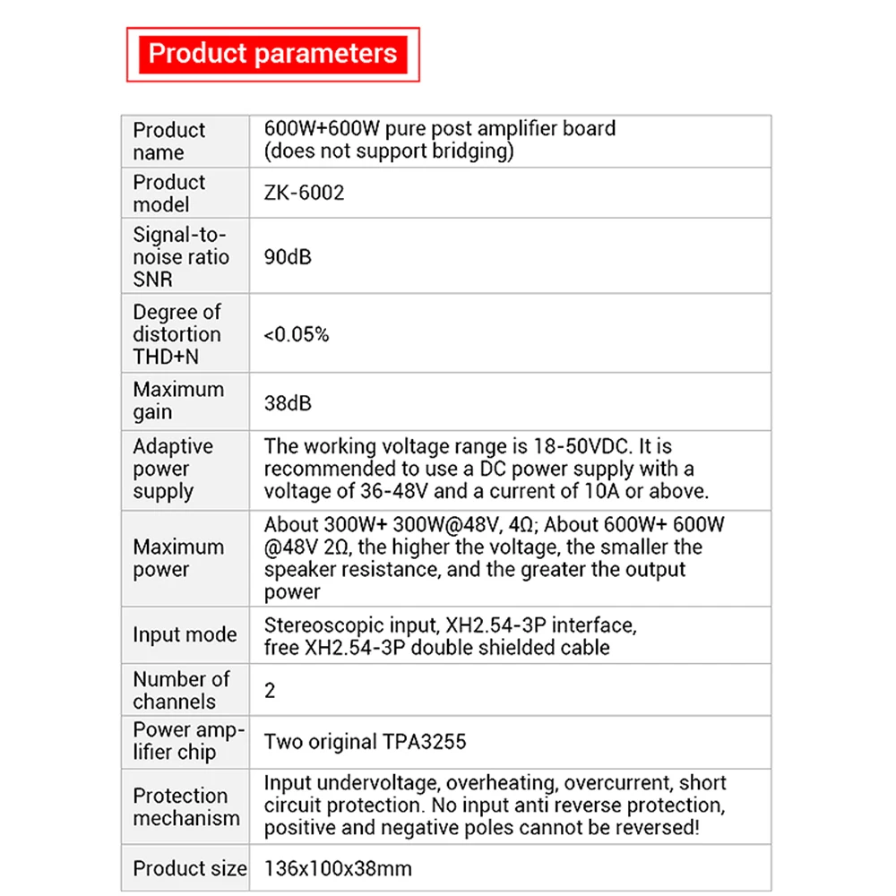 Mecanismo de protección: subtensión de entrada, sobrecalentamiento, sobrecorriente, protección contra cortocircuitos.Sin protección anti-inversión de entrada, ¡los polos positivo y negativo no se pueden invertir!