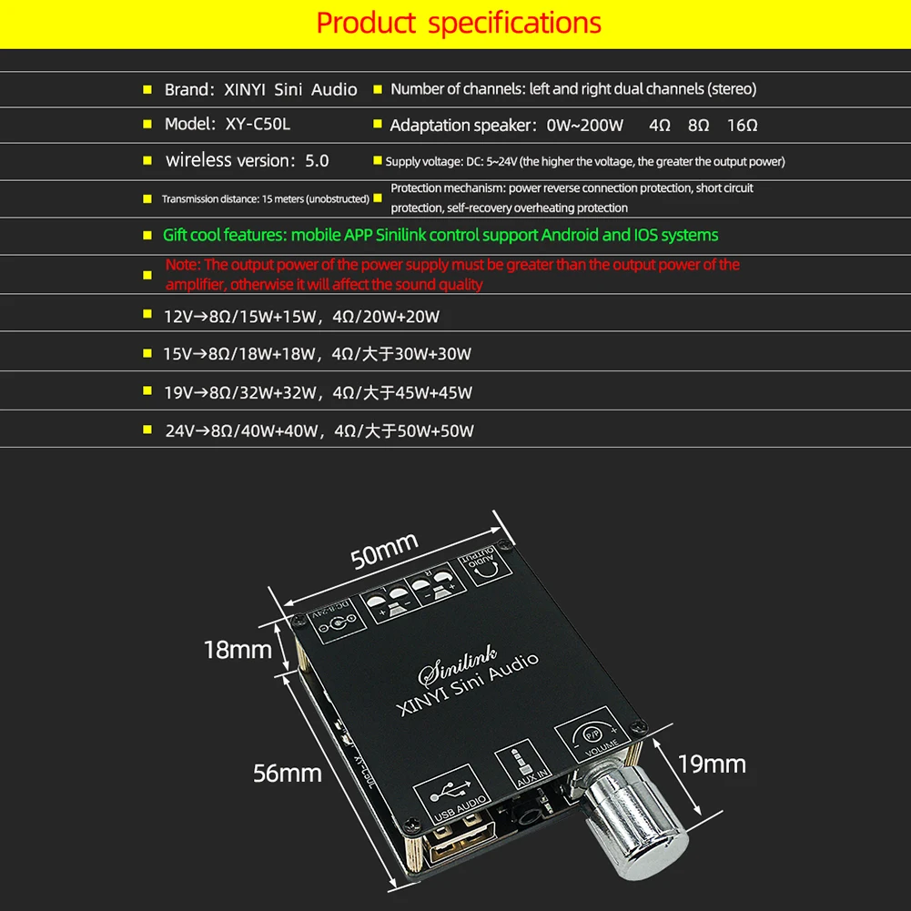 Este producto puede emitir continuamente un amplificador de potencia de 50W * 2, se pueden pulsar altavoces de 10W ~ 200W, se recomienda un altavoz de 8 ohmios o 4 ohmios.