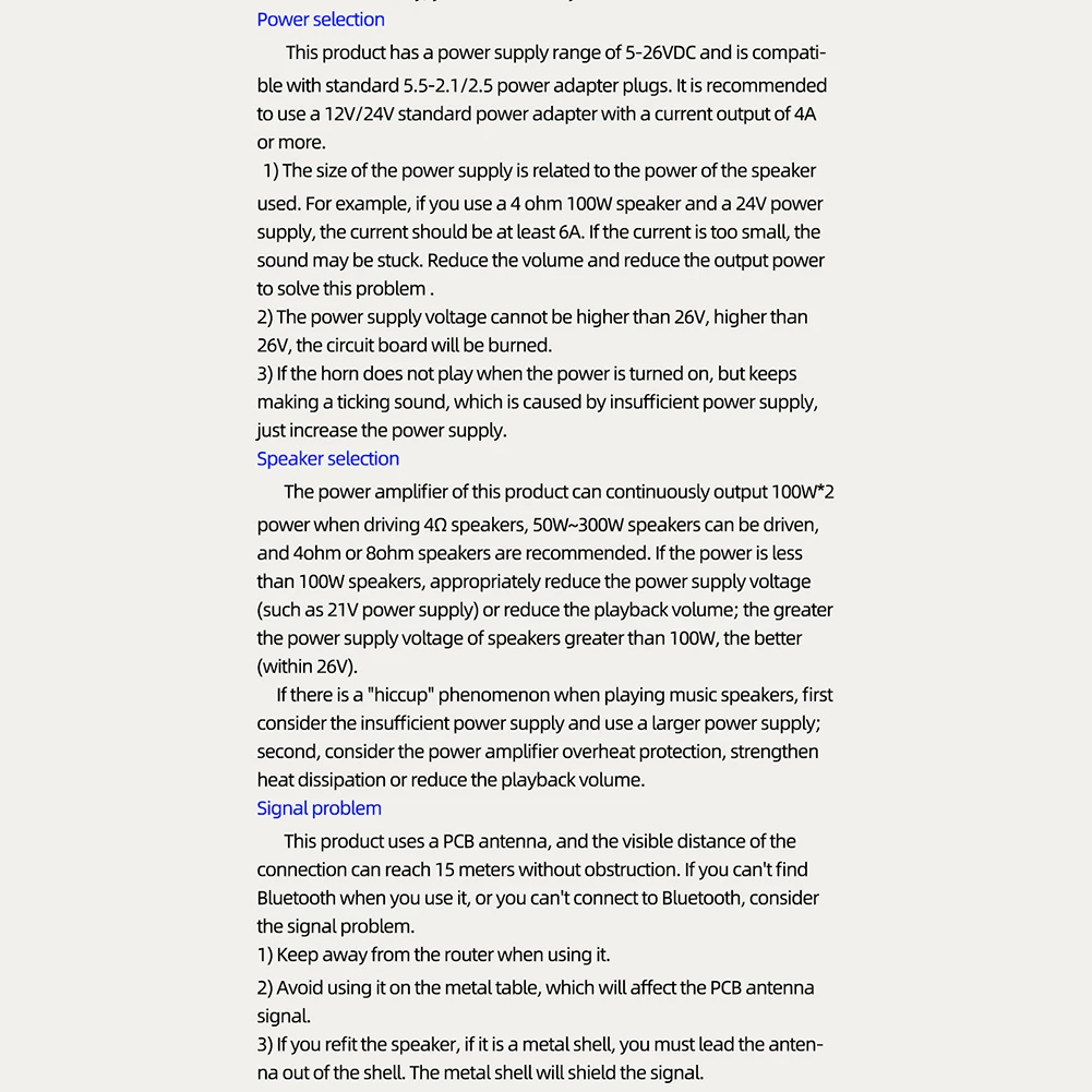 Si la potencia está dentro de 50W del altavoz, el voltaje de fuente de alimentación más bajo apropiado (como la fuente de alimentación de 12V) o baje el volumen de reproducción; mejor voltaje de fuente de alimentación de bocina de más de 50W (26V menos).