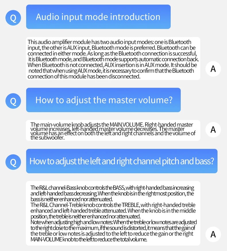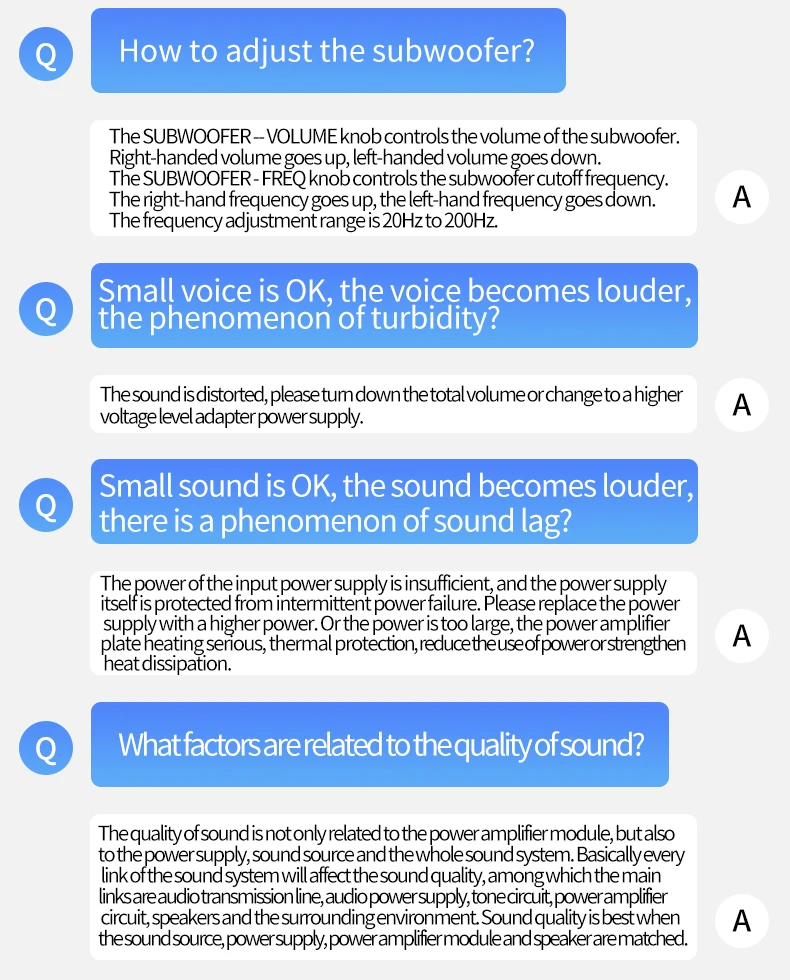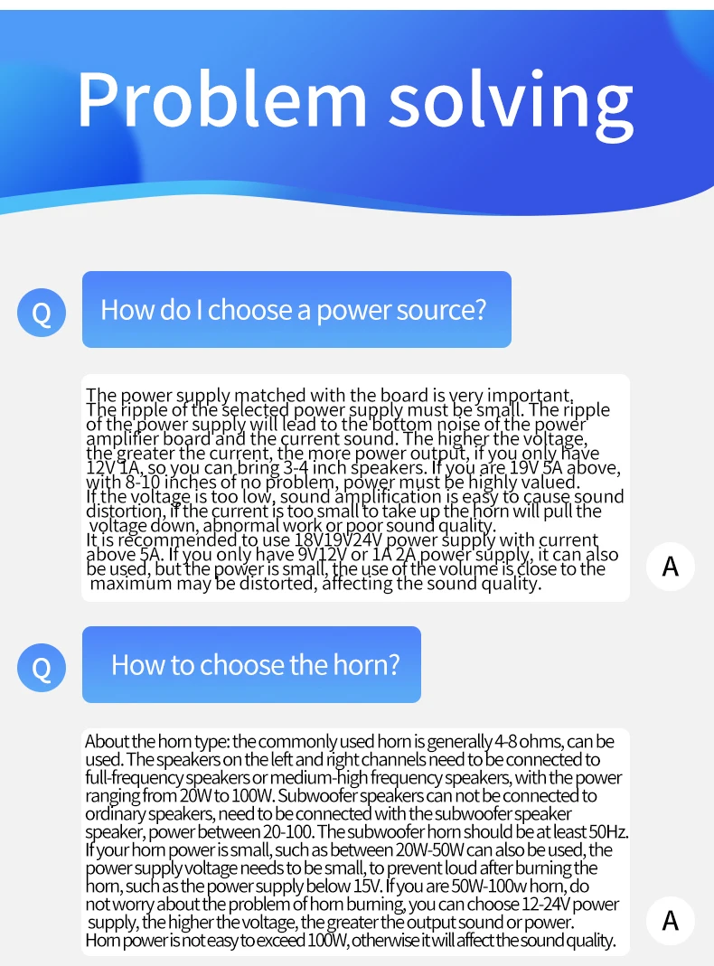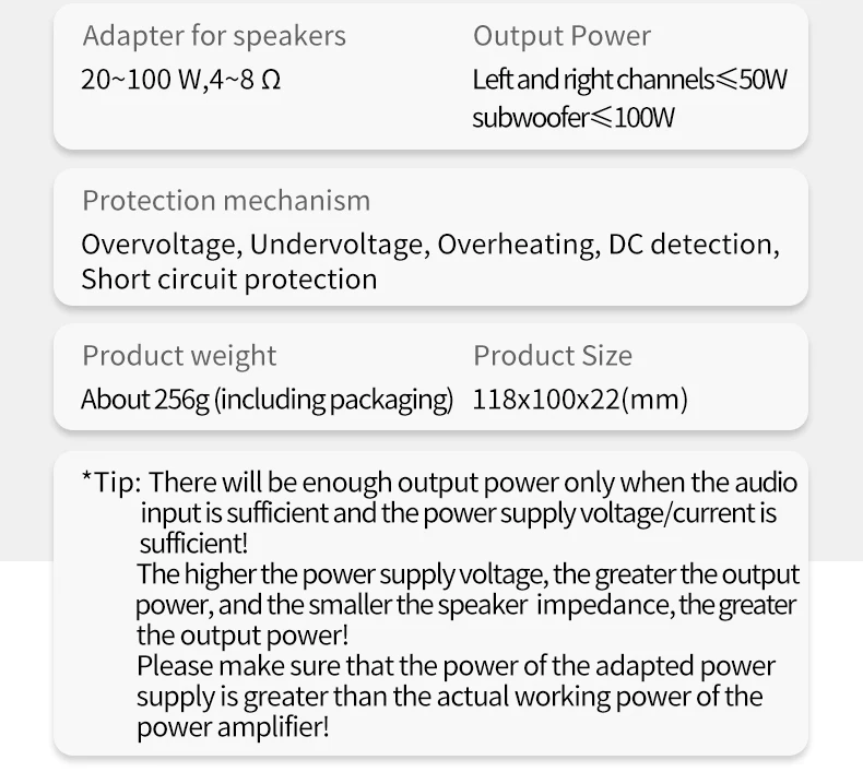 ¡Solo cuando haya suficiente entrada de audio y suficiente voltaje/corriente de fuente de alimentación, habrá suficiente potencia de salida!Cuanto mayor sea el voltaje de la fuente de alimentación, mayor será la potencia de salida y cuanto menor sea la impedancia del altavoz, mayor será la potencia de salida.¡Asegúrese de que la potencia de la fuente de alimentación adaptada sea mayor que la potencia de funcionamiento real del amplificador!