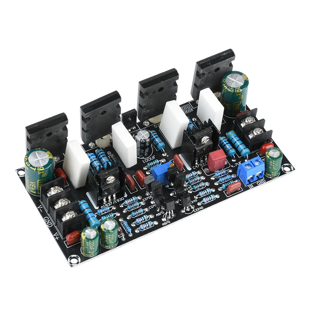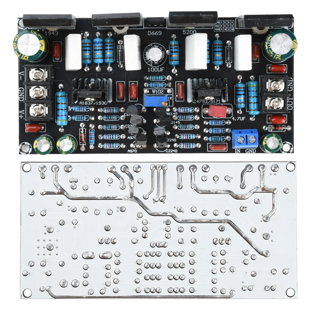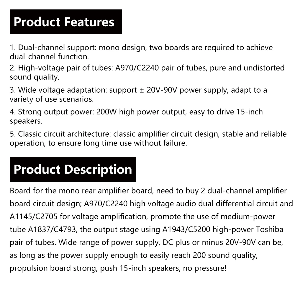 La placa es una placa amplificadora de post mono y, si se requiere un canal dual, es necesario comprar dos placas amplificadores para el diseño y uso del circuito;El circuito diferencial dual de tubo de audio de alto voltaje A970/C2240 y la amplificación de voltaje A1145/C2705 se utilizan para promover el uso del tubo de potencia media A1837/C4793 y la etapa de salida utiliza un tubo de alta potencia A1943/C5200.Se puede utilizar un amplio rango de fuente de alimentación, CC positivo y negativo de 20 V a 90 V, siempre que se suministre energía suficiente, puede alcanzar fácilmente 200.¡Buena calidad de sonido, placa de fuerza motriz fuerte y altavoz de 15 pulgadas que se pueden empujar sin presión!