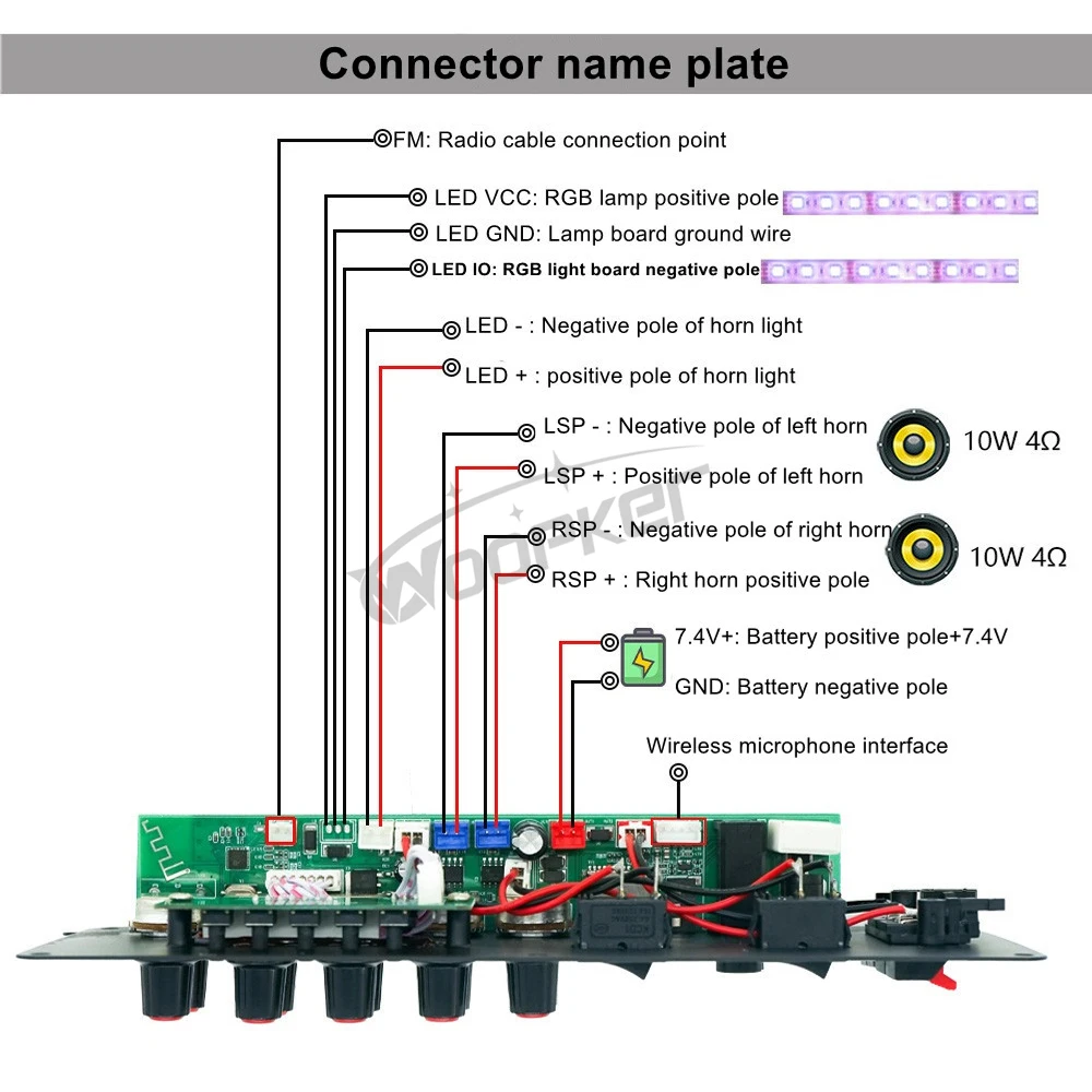 ● Los polos positivo y negativo de la batería deben estar conectados según esta imagen; de lo contrario, la placa se quemará.