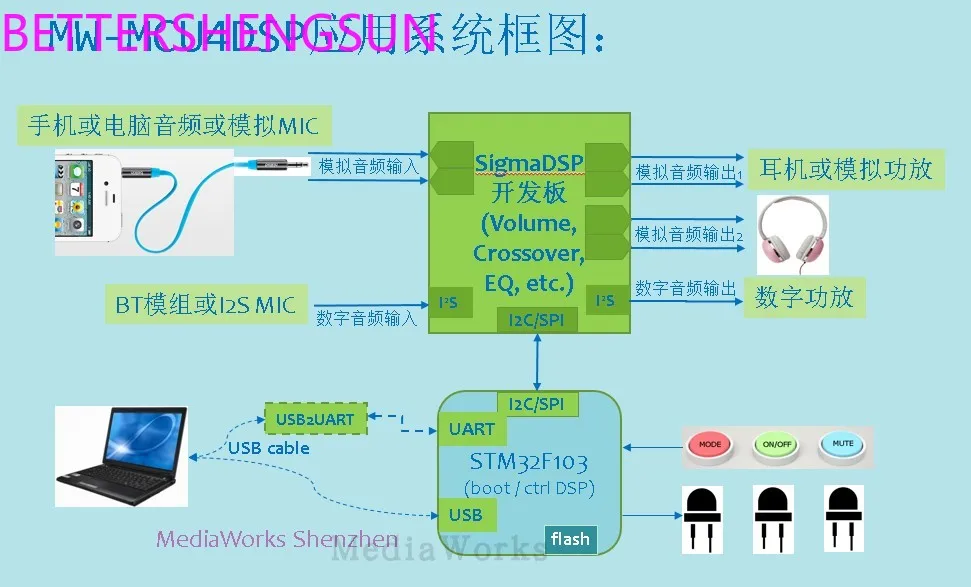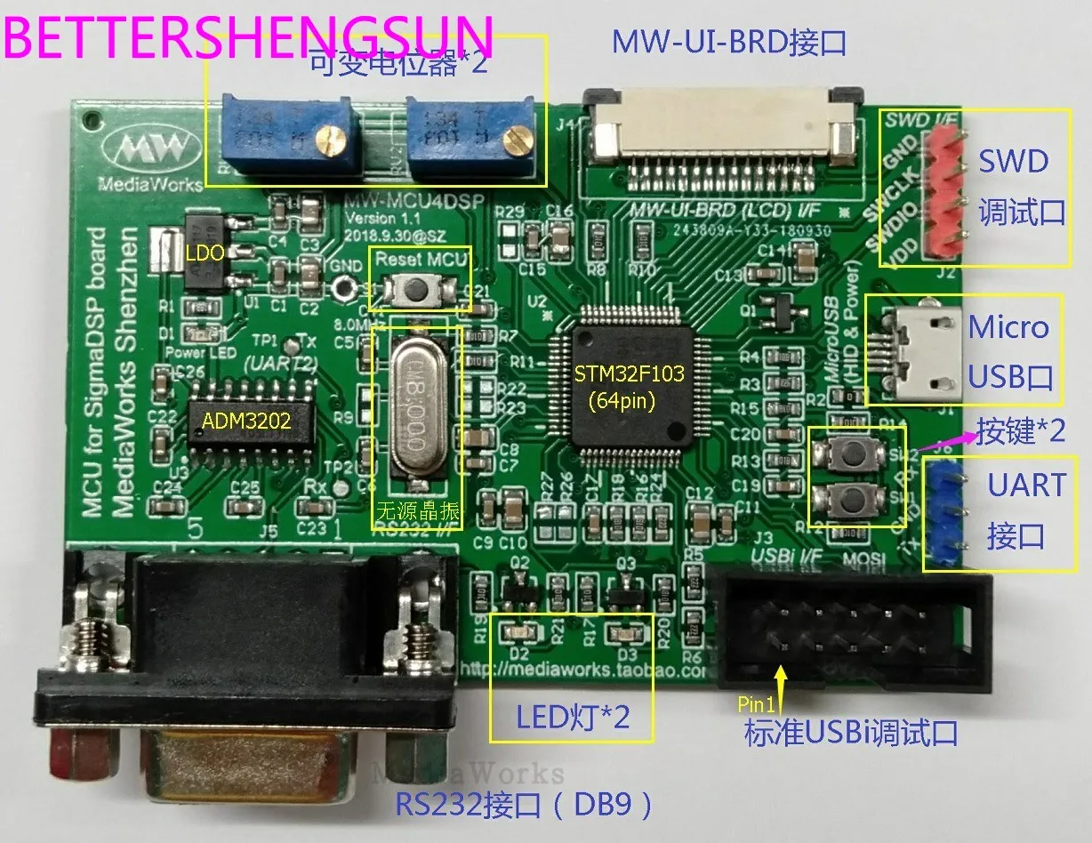 MW-MCU4DSP El tablero está diseñado para la CoordinaciónSigmaDSP ADI (IncluidoADAU170X/1761/145X/146X/1772/1777/1787 Etc.) diseñado por Development BoardMCU Tablero. Se basa enST EmpresaCorteza M3 Procesador kernel STM32F103RET6 , A travésSWD Desarrollo y depuración de puertos de depuración, placa de desarrollo también estándar reservadoUSBi Interfaz, que se puede conectar directamenteSigmaDSP La Placa de desarrollo está conectada.