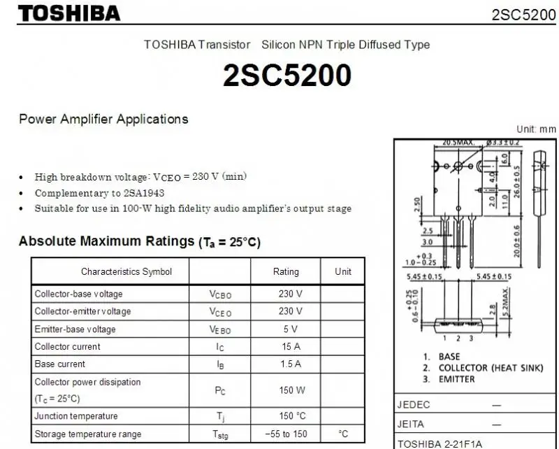 4. ¡Salida de tubo grande 2SC5200 T-oshiba! ¡Este tubo tiene una potencia máxima de hasta 150W, lo que permite que el 1969 emita un máximo de 25W Clase A! ¡Más que 2N3055!