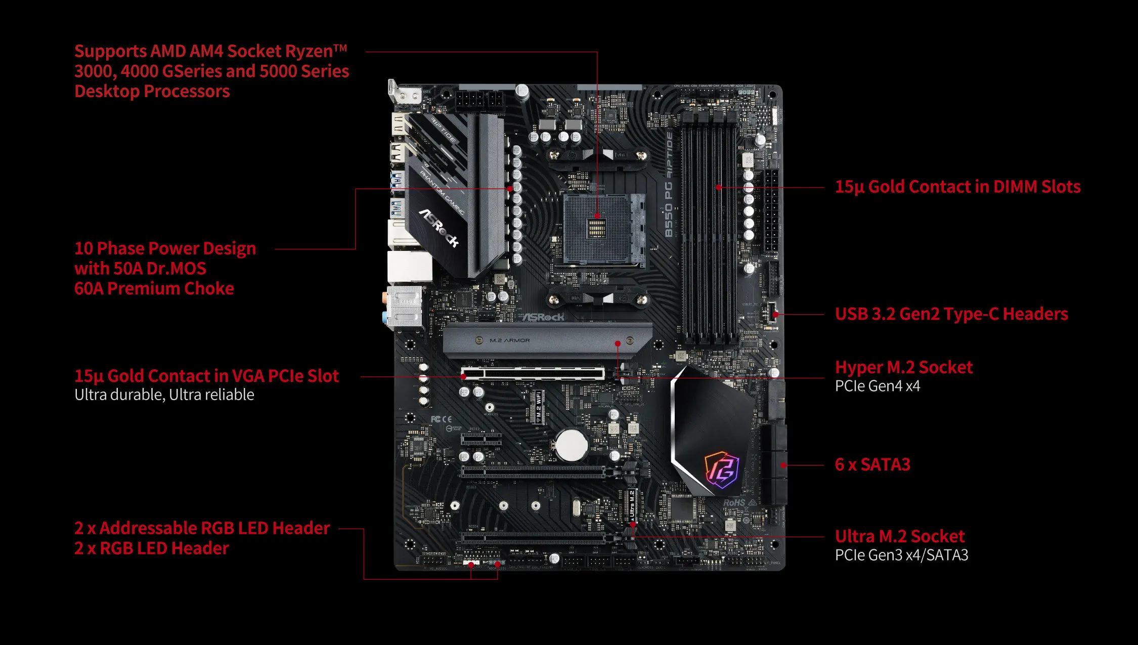 - Compatible con AMD AM4 Socket Ryzen™ Procesadores de escritorio 3000, 3000 G-Series, 4000 G, 5000 y 5000 G-Series*