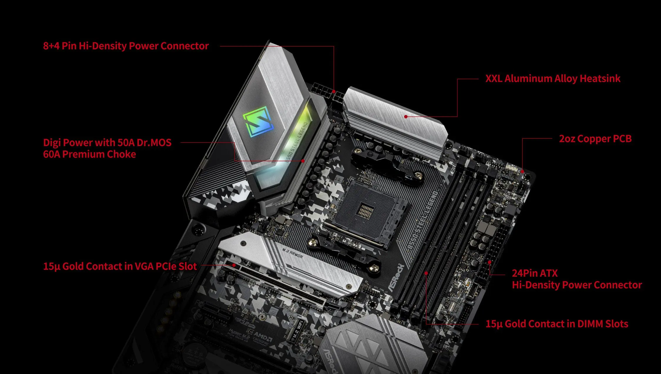 - Compatible con AMD AM4 Socket Ryzen™ Procesadores de escritorio 3000, 3000 G-Series, 4000 G, 5000 y 5000 G-Series*
