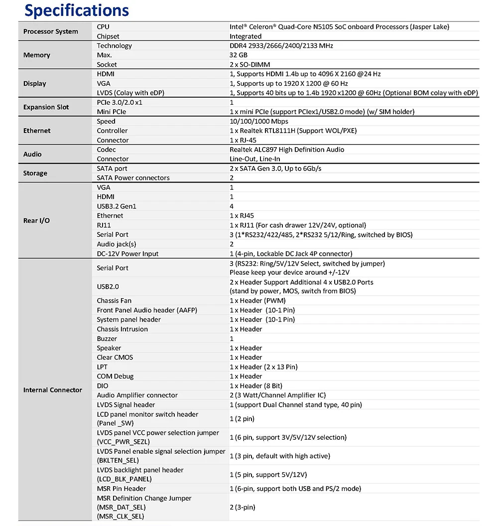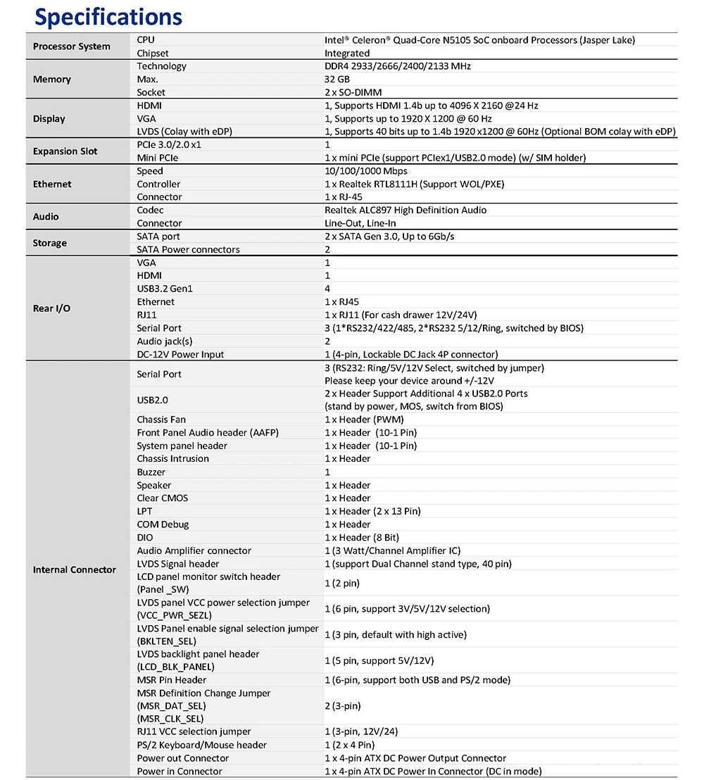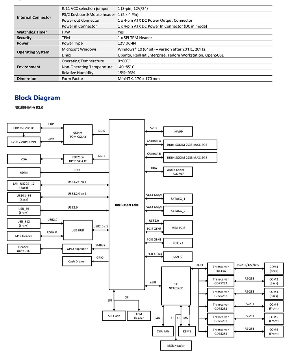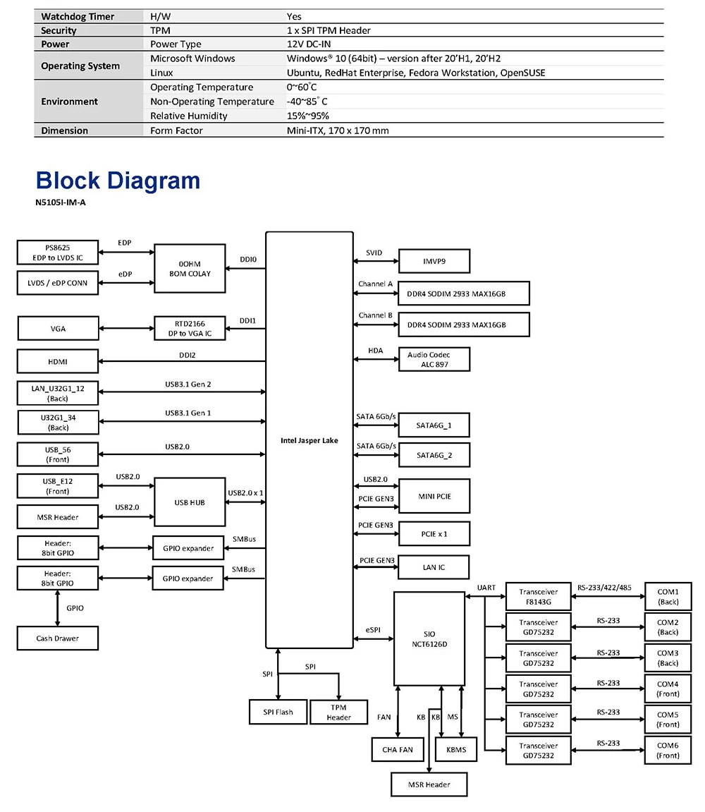 Mini-ITX, N5105 SoC, 2*SO-DIMM, VGA, HDMI, LVDS, 6*COM, 8*USB, mercado POS dedicado