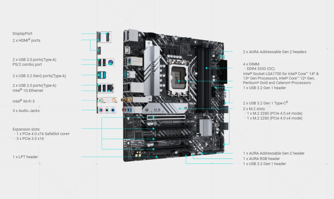 Placa base ASUS PRIME B660M-A AC D4 Intel B660 compatible con I9-14900 I5-14600 14400F 13400 CPU LGA 1700 DDR4 128 GB PCIe 4.0 HDMI M.2 mATX