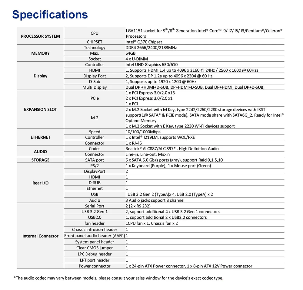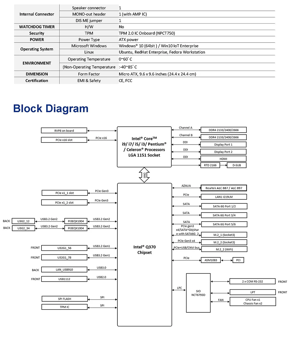 Micro ATX, zócalo LGA1151 para CPU de 9a/8.a generación, chipset Q370, 4*U-DIMM, 1*PCIe x16,2*DP, HDMI, D-SUB, Intel® soporte vPro