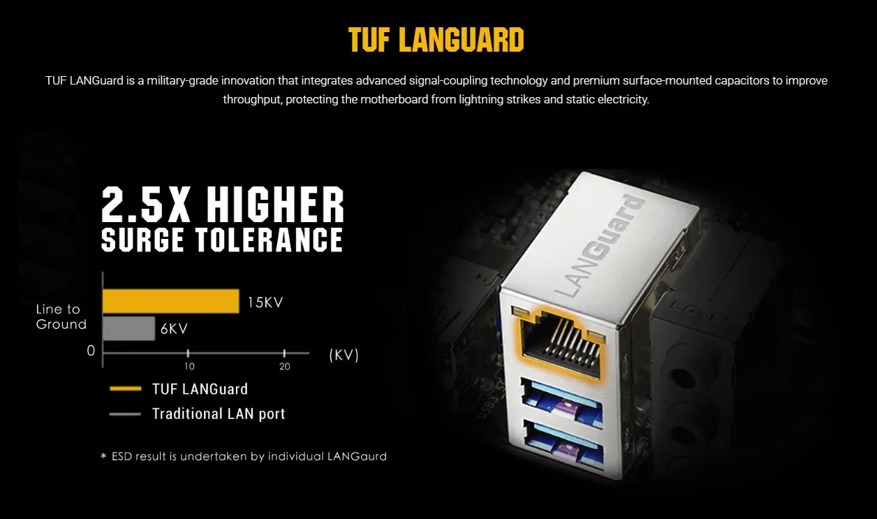 Hecho para juegos en línea:Ethernet de 2,5 Gb, ranura M.2 (llave E) para módulo Wi-Fi, TUF LANGuard y tecnología Turbo LAN