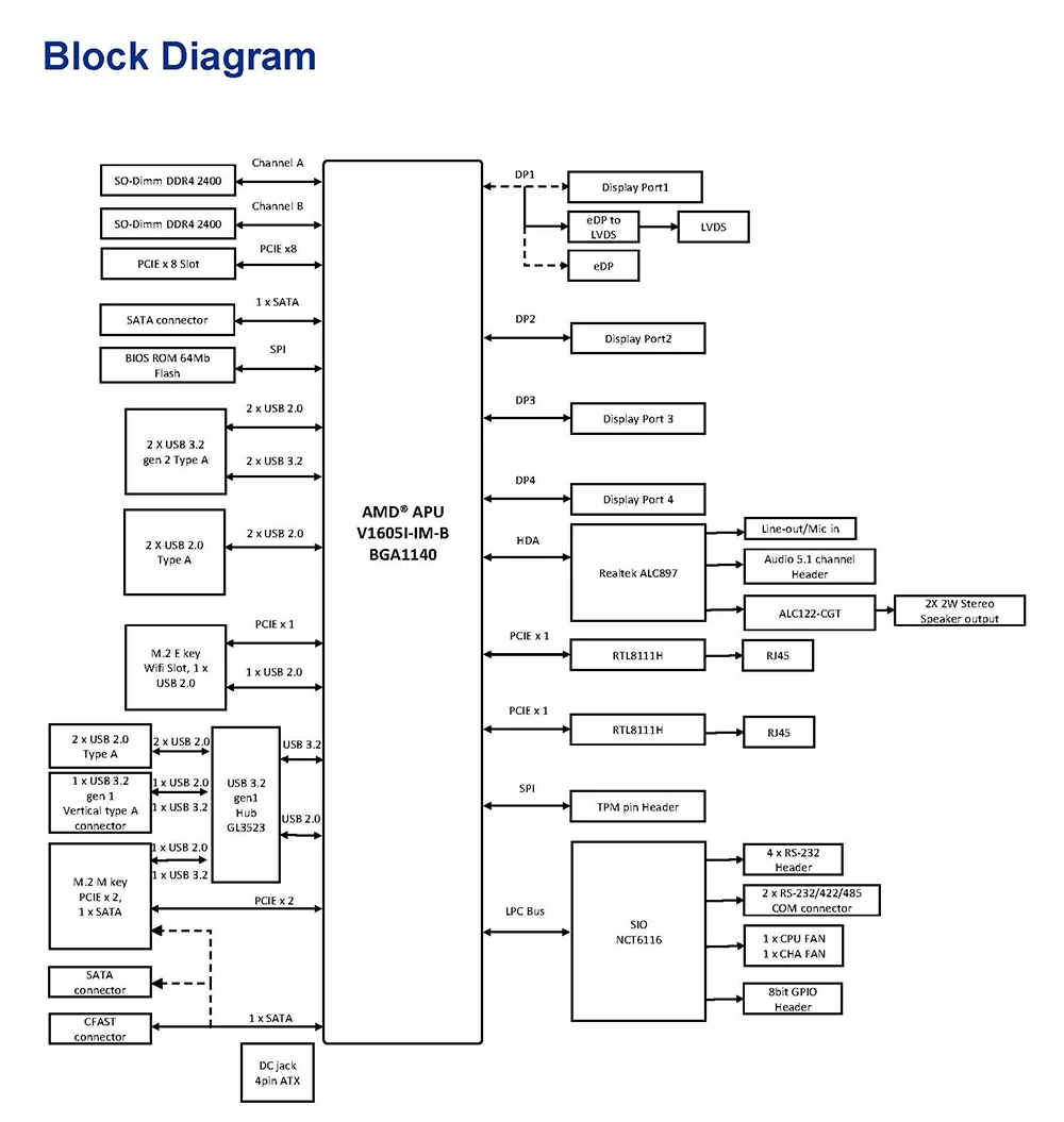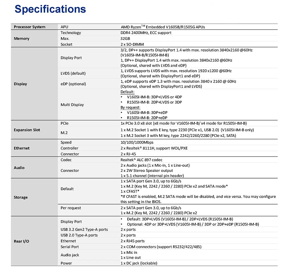 Mini-ITX, APU V1605/R1505G integrado serie V/R1000 de AMD RyzenTM, 2 x SO-DIMM