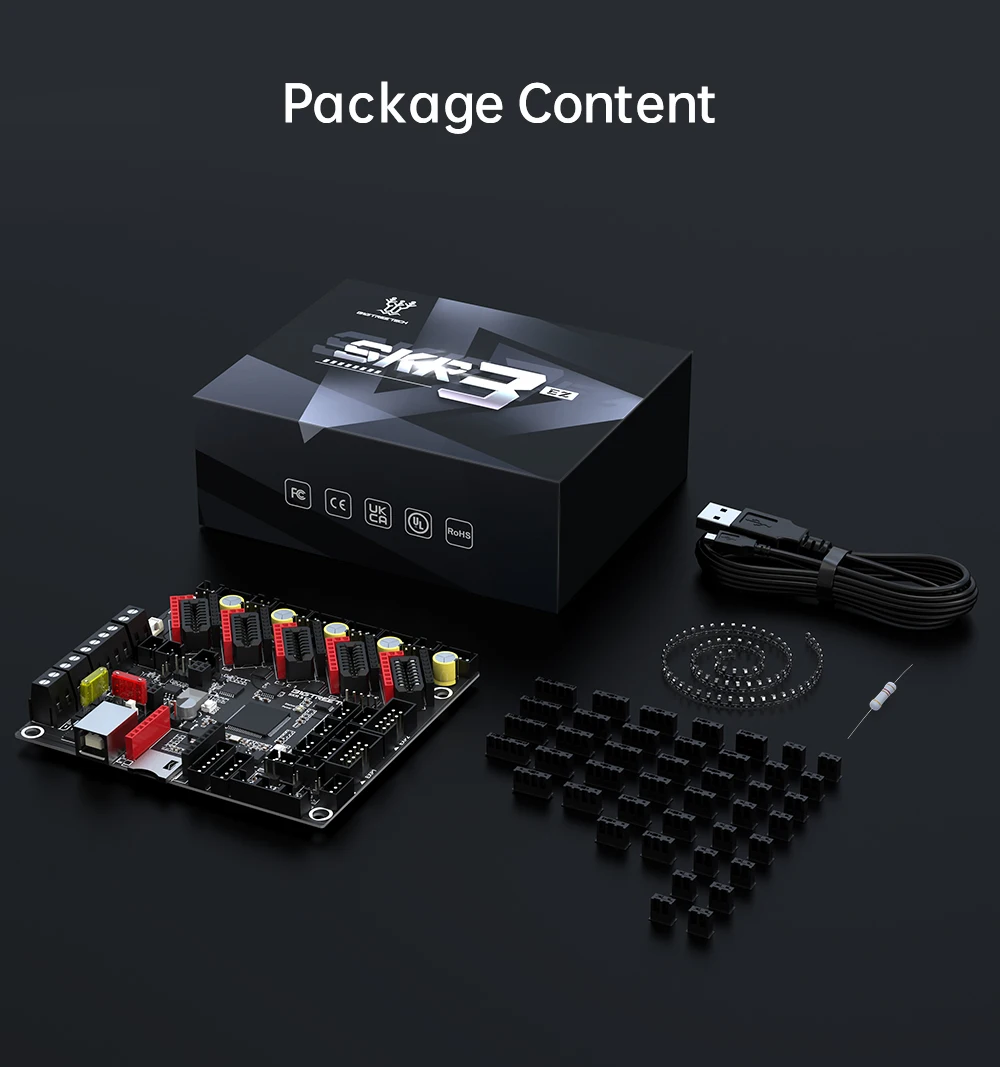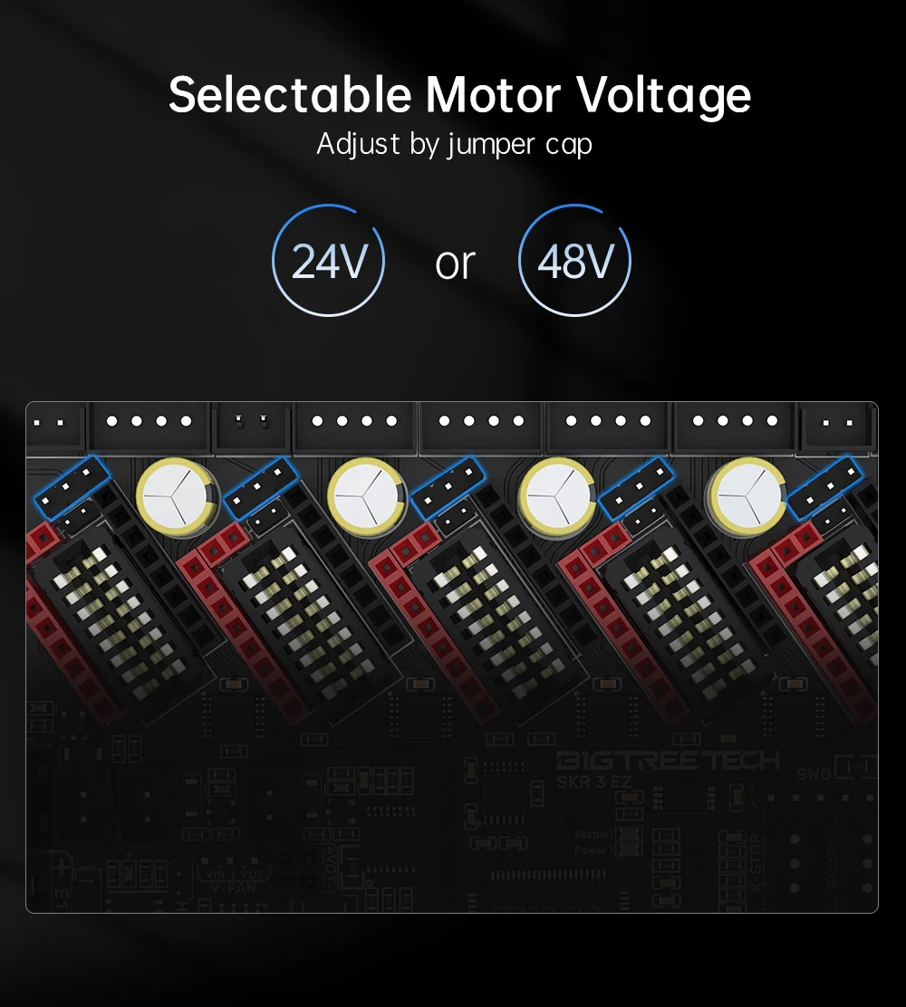Alto voltaje del motor distinto.El voltaje del motor SKR 3 es de 12 V CC a 24 V, mientras que el voltaje del motor SKR 3 EZ es de 12 V a 48 V.Puedes ajustarlo con una tapa de puente.El alto voltaje puede mejorar enormemente su velocidad de impresión.Además, SKR 3 posee 2 ventiladores normales y la versión EZ posee 3 ventiladores normales, que pueden garantizar el buen funcionamiento de su impresora y mejorar la calidad de su impresión.