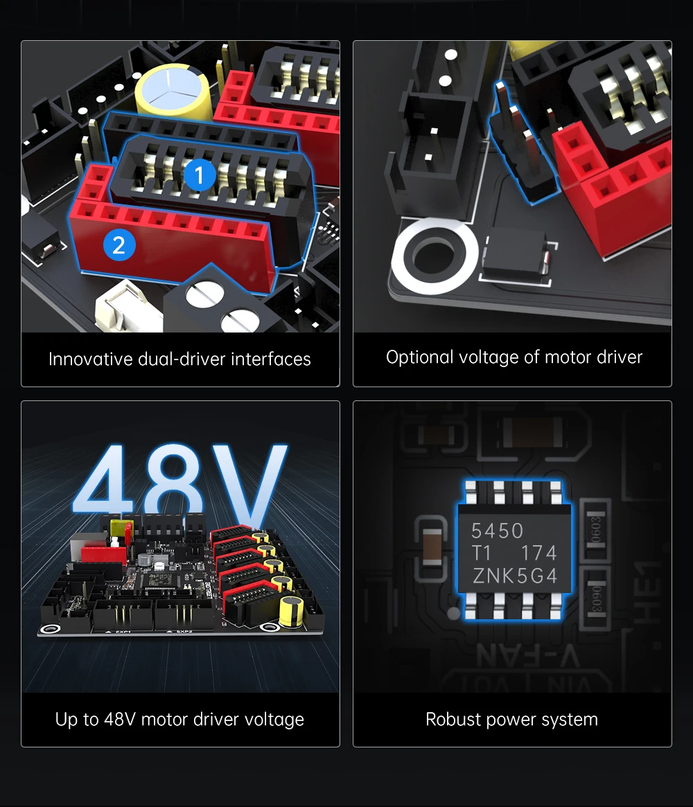 Las interfaces de controlador de motor de cinco vías, respectivamente, son X, Y Z (doble), E0 y E1, lo que hace que el funcionamiento sea más estable.El movimiento lateral de la impresora 3D generalmente se asigna al eje X y Y, mientras que el eje Z corresponde al movimiento vertical.Las extrusoras dobles podrían permitirle imprimir dos objetos al mismo tiempo, mejorando la eficiencia de su trabajo.