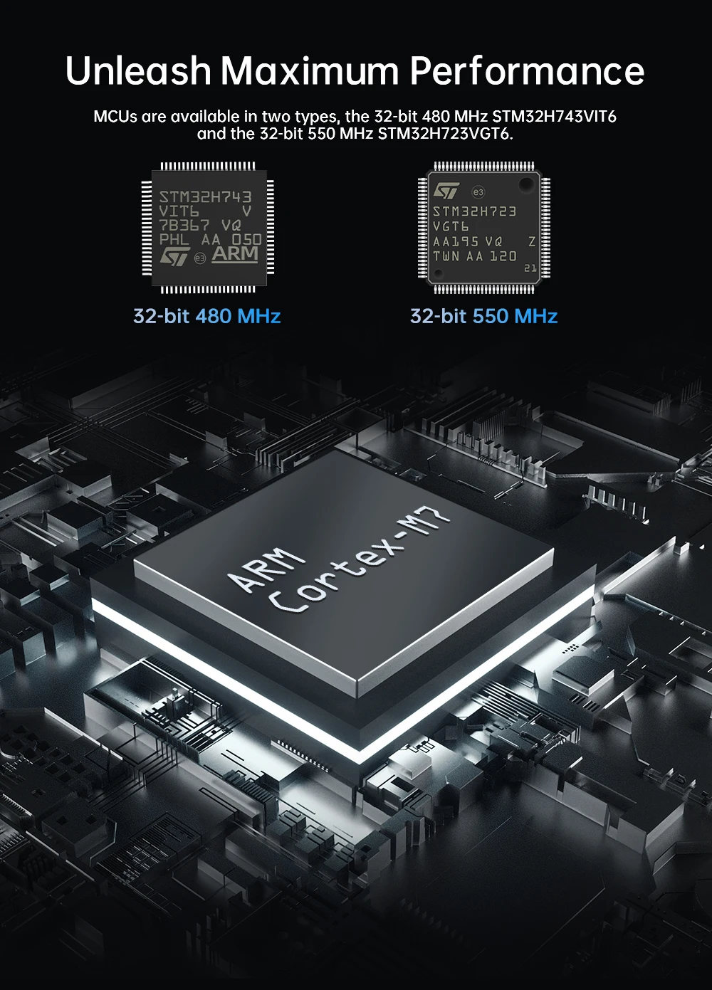 1.Utilizando el chip de control principal STM32H743VIT6/STM32H723VGT6 de la serie ARM Cortex-M7 de 32 bits, el rendimiento ha mejorado enormemente.