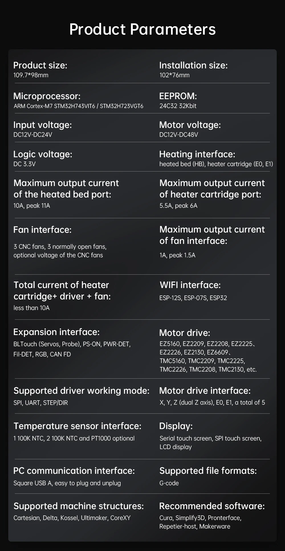 Mismos microprocesadores y firmware, tanto el microprocesador SKR 3 como SKR 3 EZ es la CPU ARM Cortex-M7 STM32H743VIT6.Y son compatibles con tres firmware, Marlin, Klipper y RepRap, que se utilizan ampliamente en el mundo de la impresión 3D.