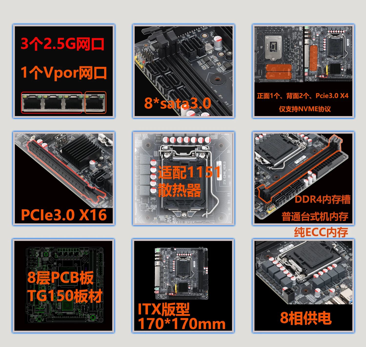 Placa base Vpro 8 SATA C246 NAS i219 Vpor Gigabit LAN con 3*i226 2,5G LAN 2*Slot DDR4 3*M.2 PCIE X16 compatible con ranura E-2100/2200