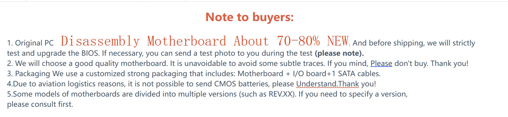 Debido a que el correo aéreo Rechaza los productos con batería, para pasar con éxito la seguridad, los productos que enviamos no incluyen batería CMOS, espero que pueda entenderlo.Para garantizar que las placas base que compró funcionen de manera estable, tenga en cuenta lo siguiente:1. Instale la memoria, CPU, HDD,LCD;2. Arranque el sistema, inicie la carga del sistema WIN8;3. La temperatura del disipador de calor Compruebe, ejecute la tarjeta gráfica de prueba 3Dmark 2003, 5-10 min. Prueba de tarjeta de sonido si tiene voz.4. Haz un vídeo de prueba y una copia de seguridad de fotos.5. Reinicie el sistema de nuevo