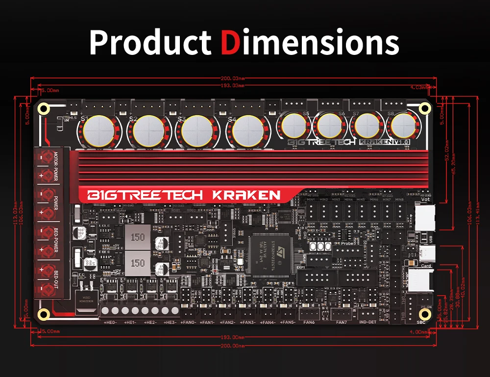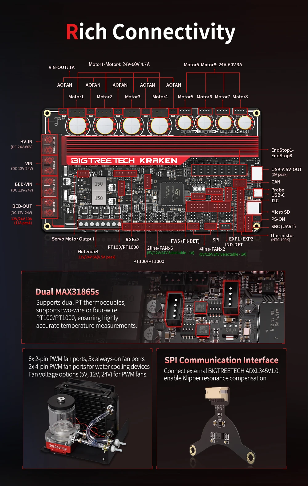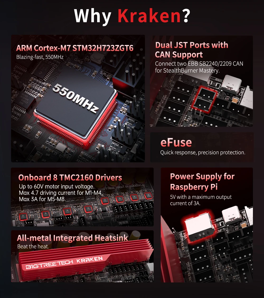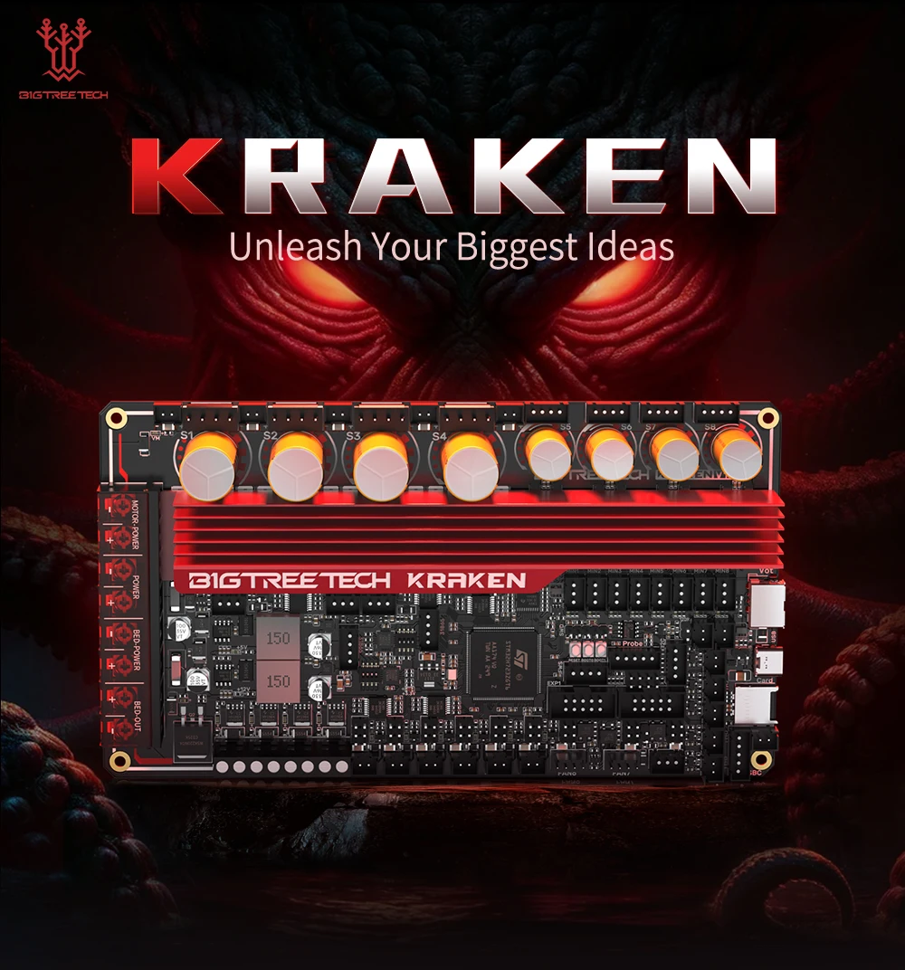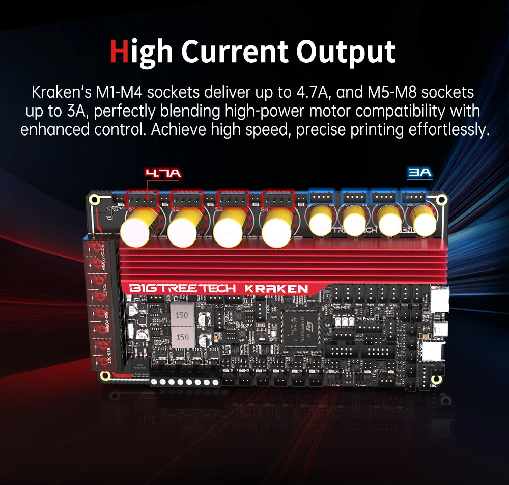 Los enchufes M1-M4 de Kraken ofrecen hasta 4,7 A y los enchufes M5-M8 de hasta 3 A, combinando perfectamente la compatibilidad del motor de alta potencia con un control mejorado.Logre una impresión precisa y de alta velocidad sin esfuerzo.