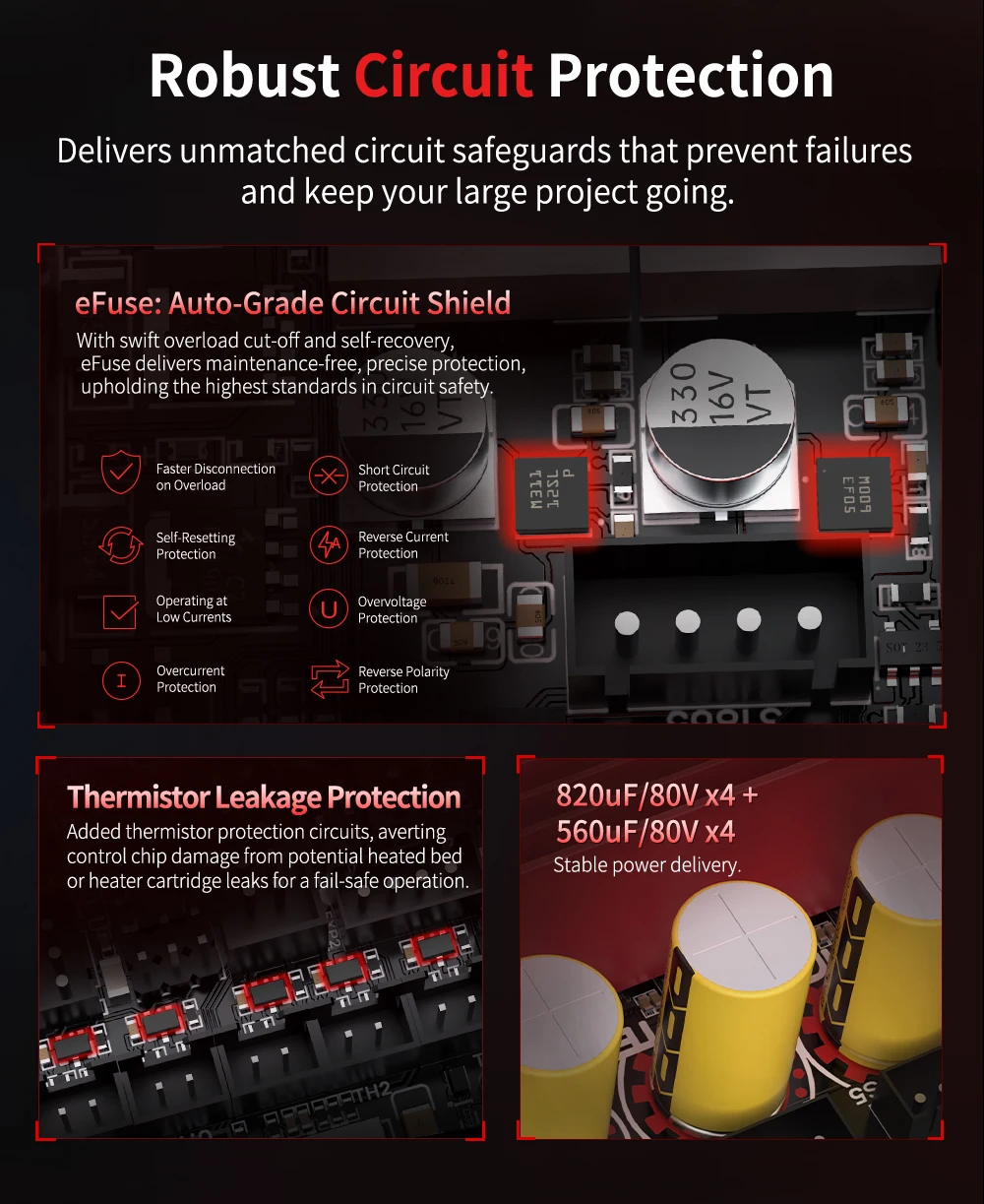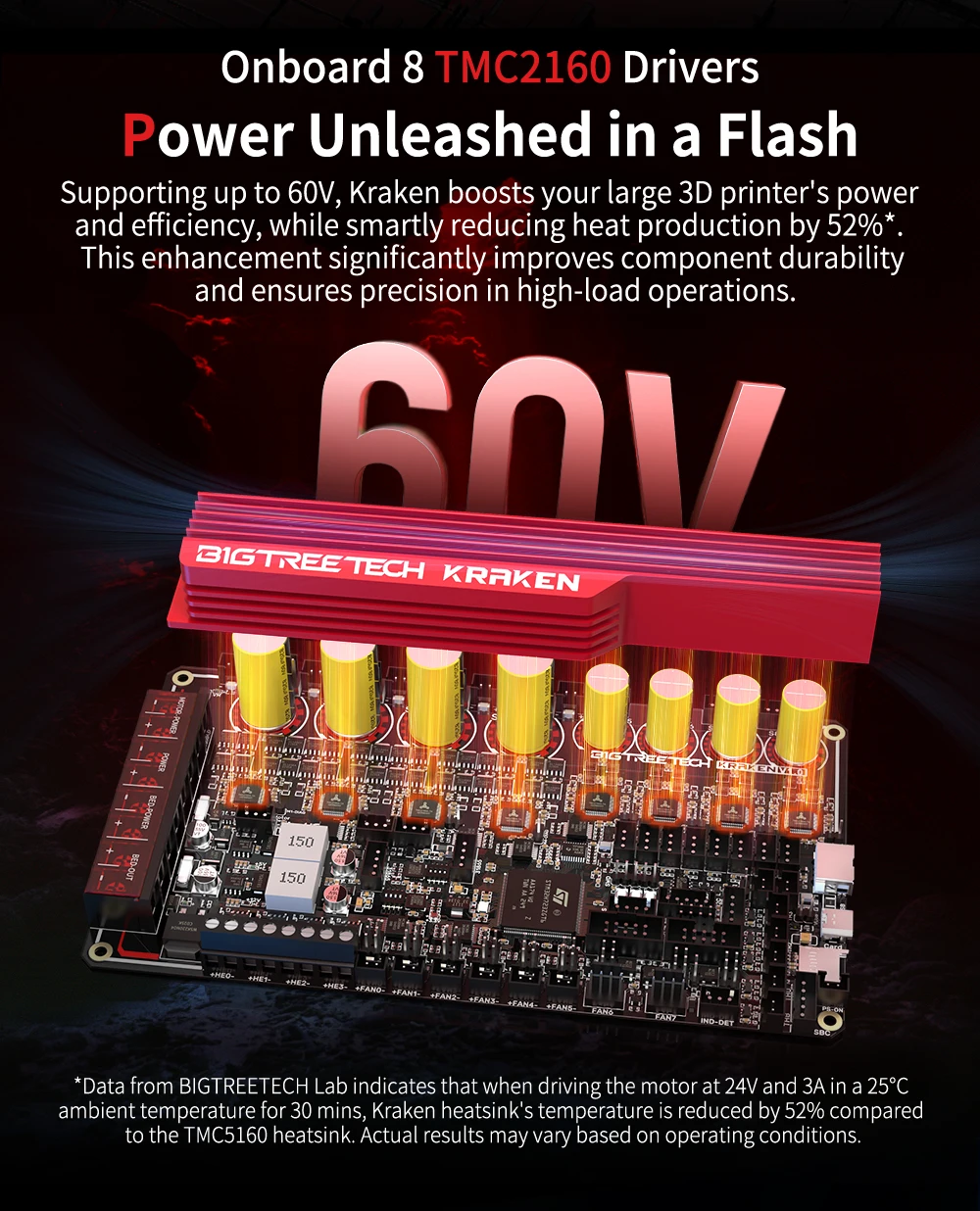 Al admitir hasta 60 V, Kraken aumenta la potencia y eficiencia de su gran impresora 3D, al tiempo que reduce de manera inteligente la producción de calor en un 52 %*. Esta mejora significativamente la durabilidad de los componentes y garantiza la precisión en operaciones de alta carga.