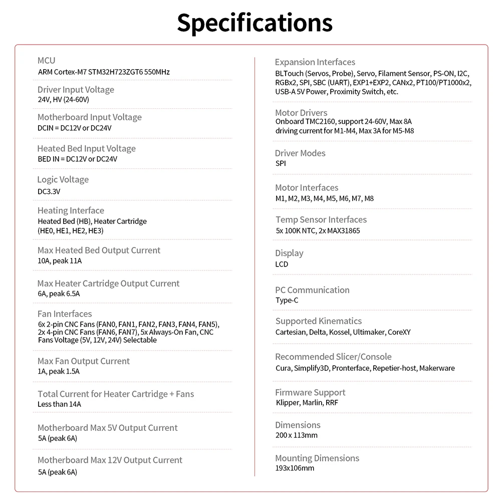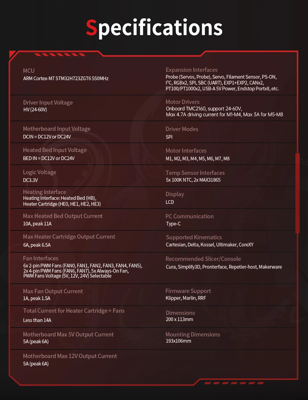 Interfaces de expansión: Sonda (Servos, Sonda), Servo, Sensor de filamento, PS-ON, I2C,RGBx2,SPI, SBC (UART), EXP1+EXP2,CANx2,PT100/PT1000x2, alimentación USB-A de 5 V, Endstop Portx8,etc.