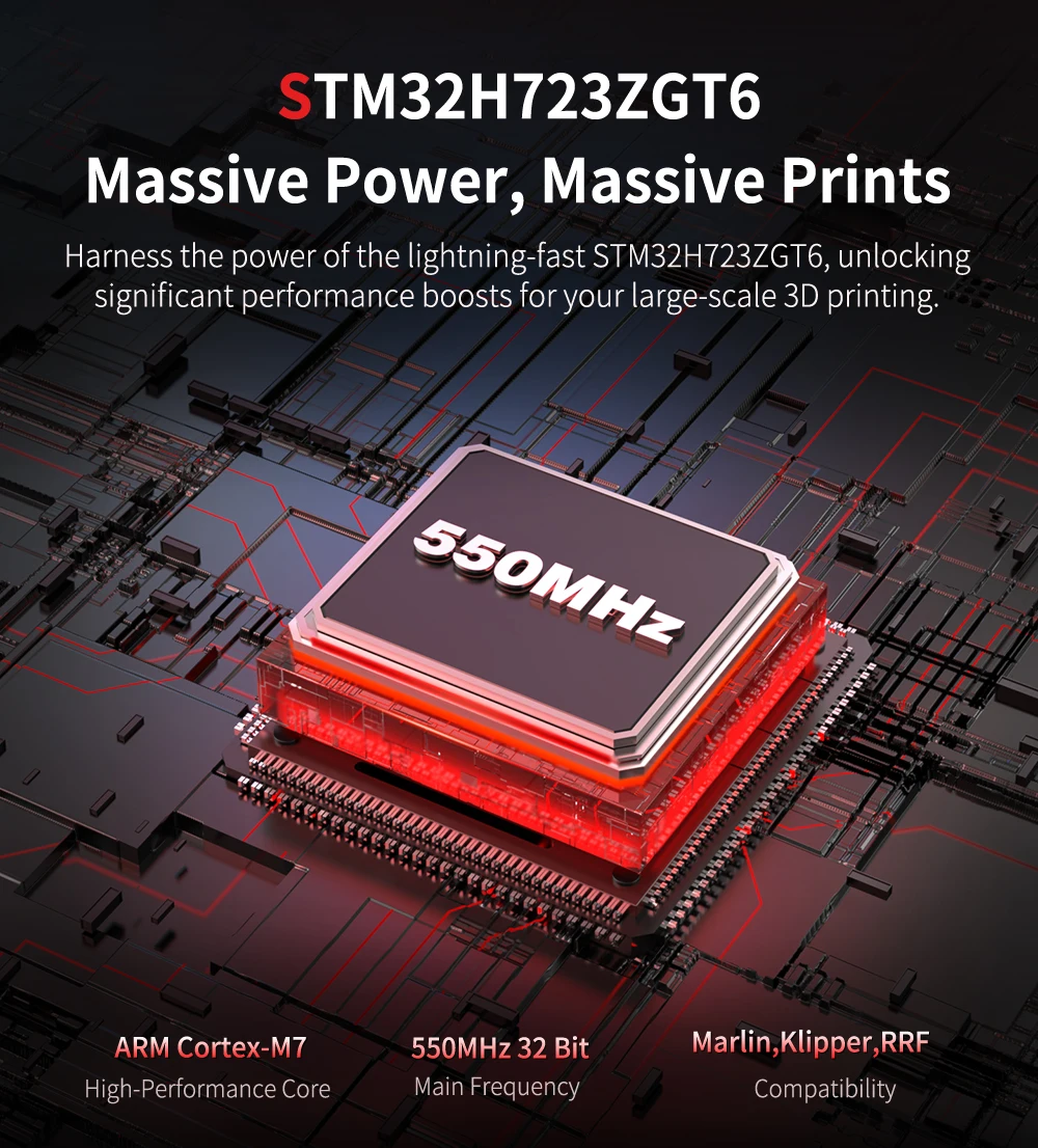 Aproveche el poder del STM32H723ZGT6 ultrarrápido, lo que desbloquea aumentos de rendimiento significativos para su impresión 3D a gran escala.