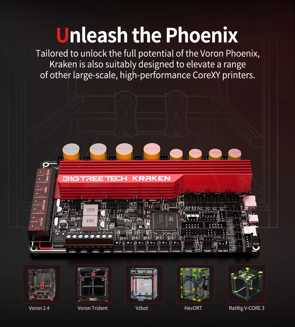 Diseñado para desbloquear todo el potencial de Voron Phoenix, Kraken también está diseñado adecuadamente para elevar una gama de otras impresoras CoreXY de gran escala y alto rendimiento.