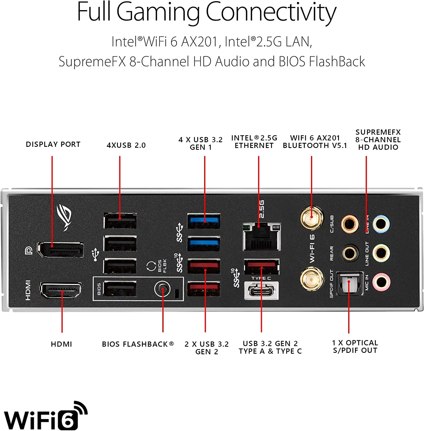 Redes de alto rendimiento:Intel® WiFi 6 AX201 (802,11 AX) integrado e Intel® 2,5 Gb Ethernet con ASUS LANGuard.