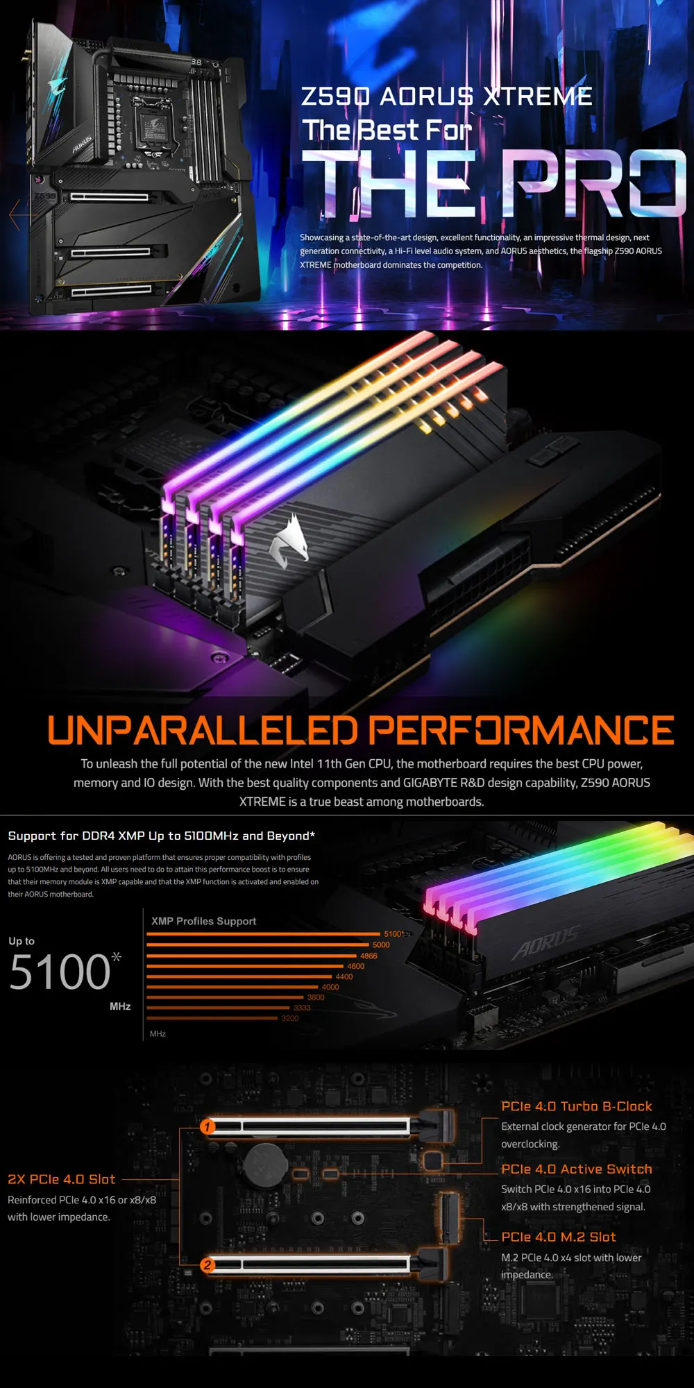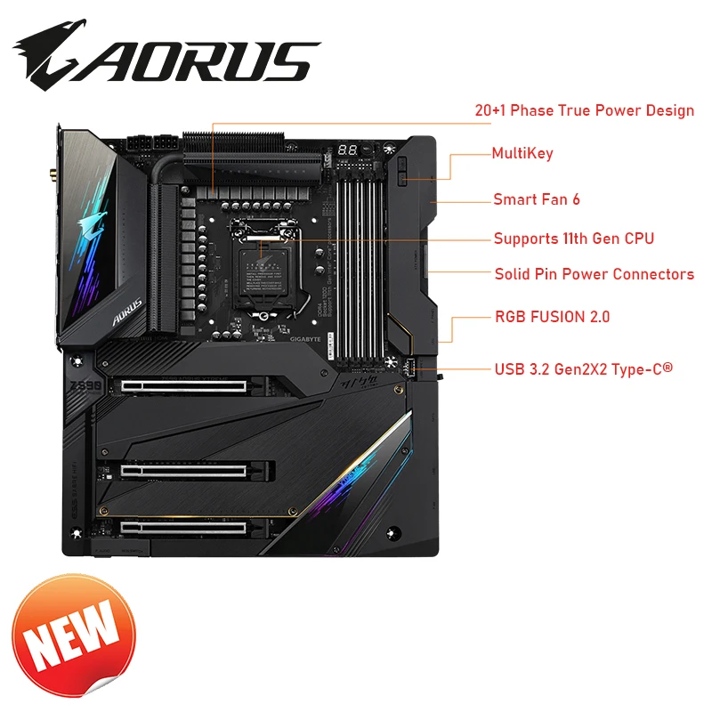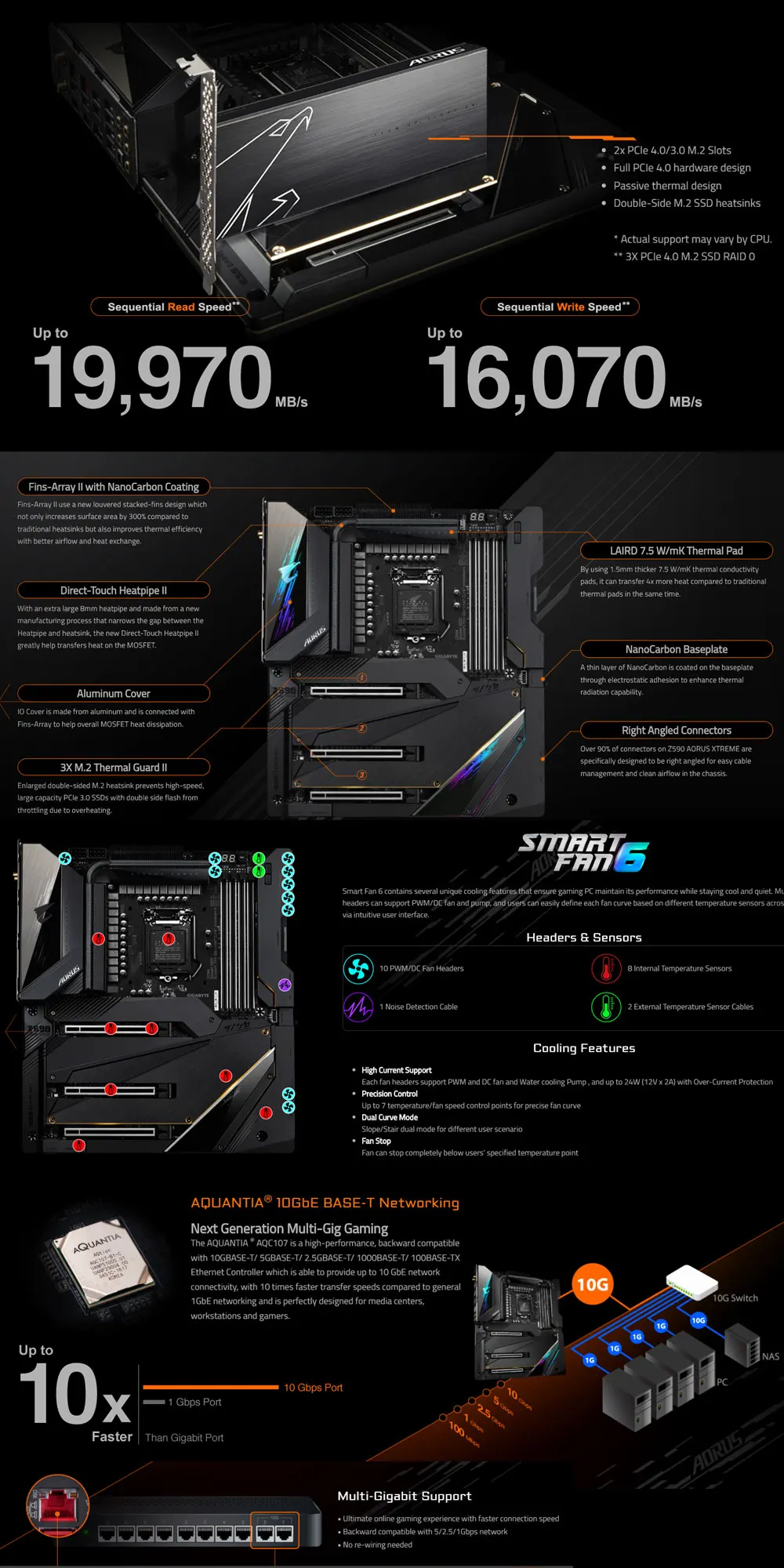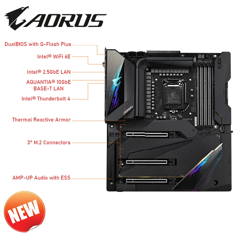 Intel® Z590 AORUS Motherboard with 20+1 Phases Digital VRM, Fins-Array II Heatsink, Direct-Touch Heatpipe II ,NanoCarbon Baseplate, Intel® Thunderbolt 4, ESSential USB DAC, AORUS PRO Gen4 AIC Adaptor, Intel® WiFi 6E 802.11ax, AQUANTIA® 10GbE LAN