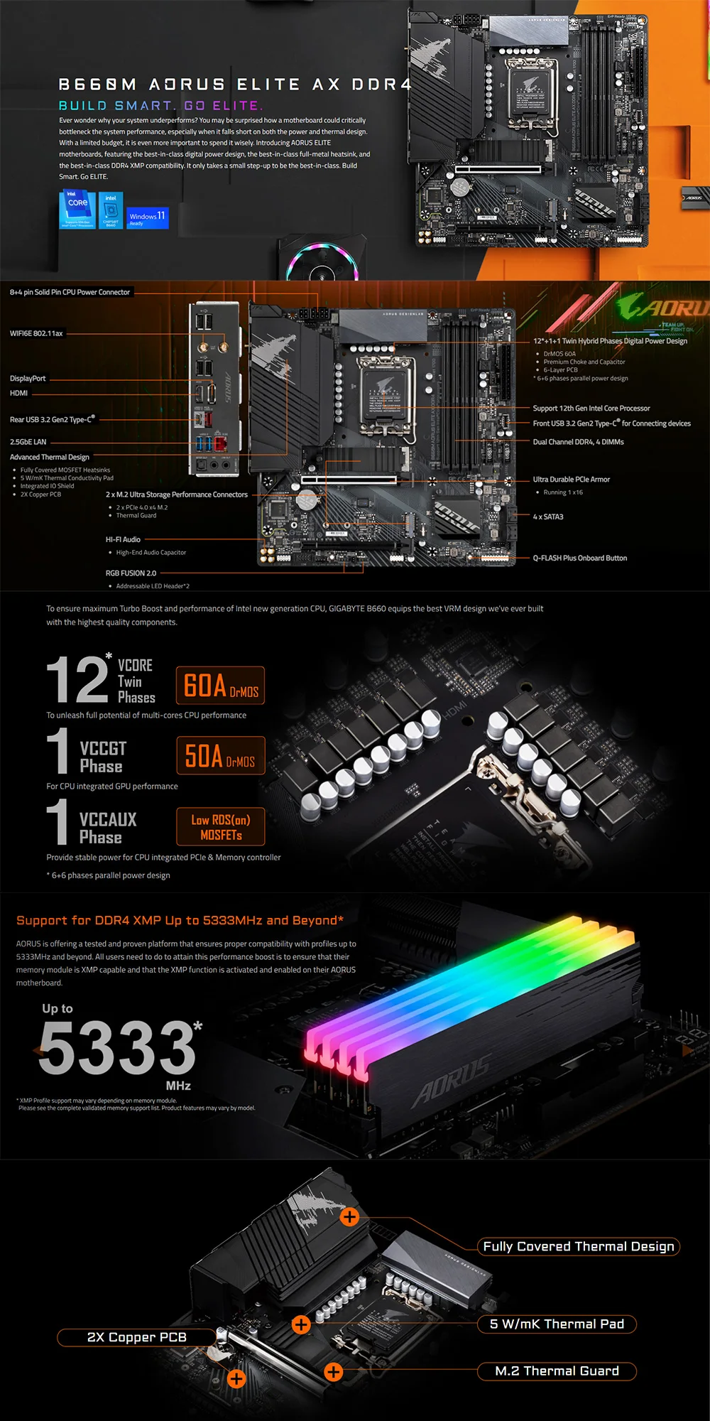 La placa base Intel® B660 AORUS adopta un diseño de fuente de alimentación digital de 12 + 1 + 1 fase, diseño de disipación de calor de cobertura total, PCI-E 4,0 M.2 ranuras SSD con armadura de disipación de calor, tarjeta de red de alta velocidad 2,5 Gigabit, RGB FUSION 2,0, Q-Flash Plus