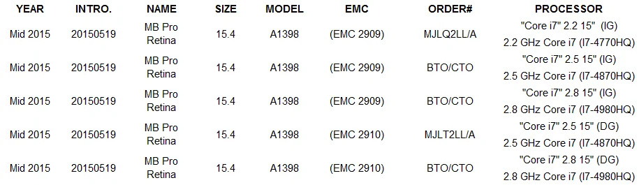 La placa base A1398 2015 tiene gráficos discretos (DG) y gráficos integrados (IG), el disipador de calor es diferente, determine qué tarjeta gráfica es su placa base antes de instalar, instale los accesorios correctos, Y luego encender. Evite instalar los accesorios incorrectos que podrían causar que la placa base se queme.