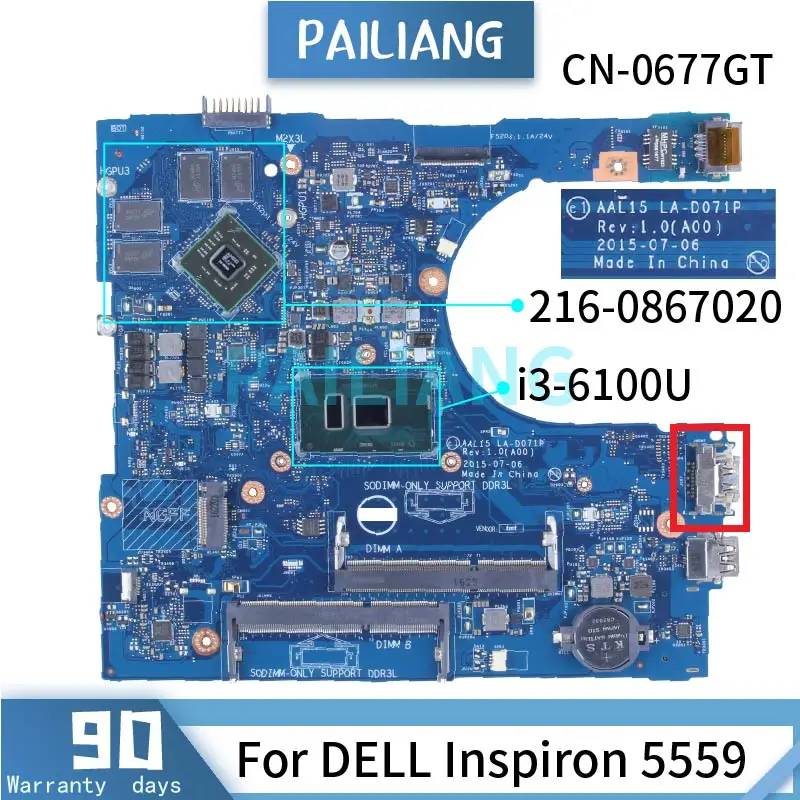 Comprar Placa base para portátil DELL Inspiron 5559, i3-6100U, 0677GT, SR2EU, DDR3, 216-0867020