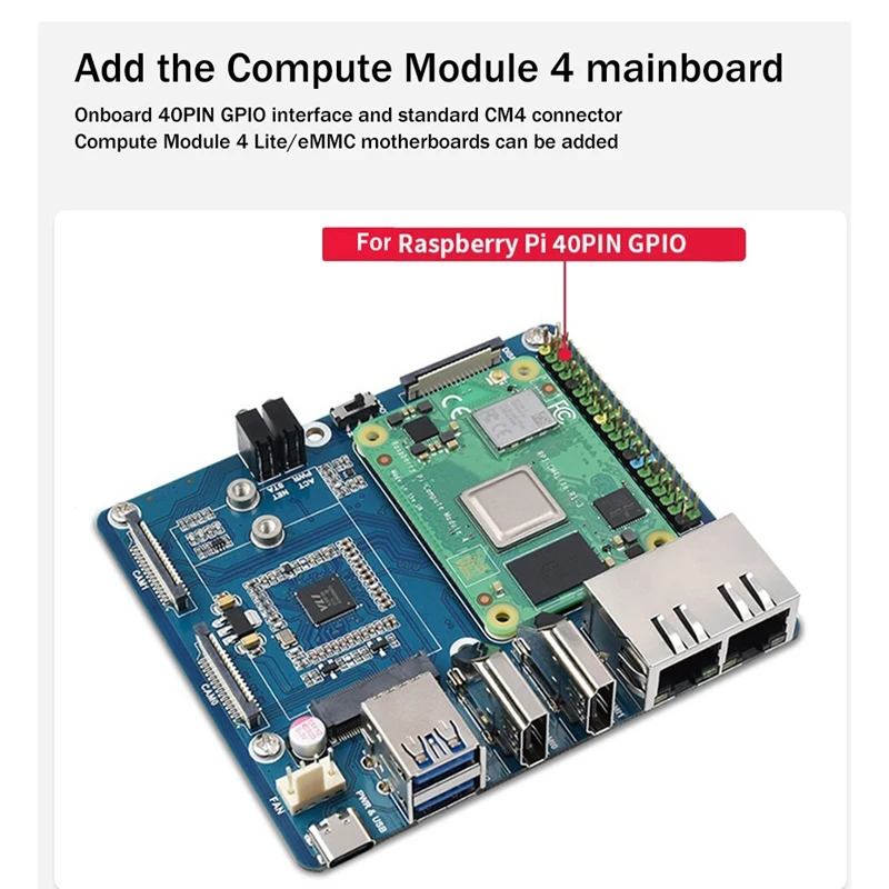 La interfaz GPIO de 40 pines integrada y el conector CM4 estándar admiten el acceso a las placas base de la serie Compute Module 4 Lite/eMMC.