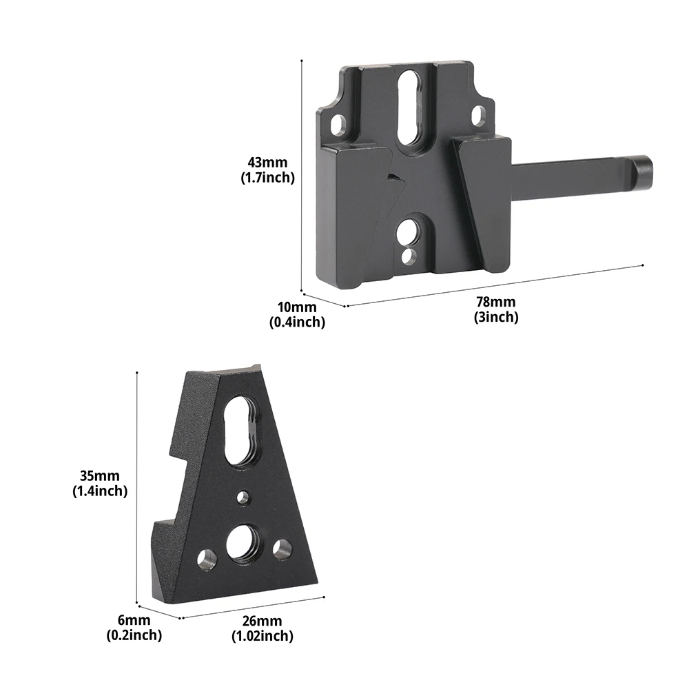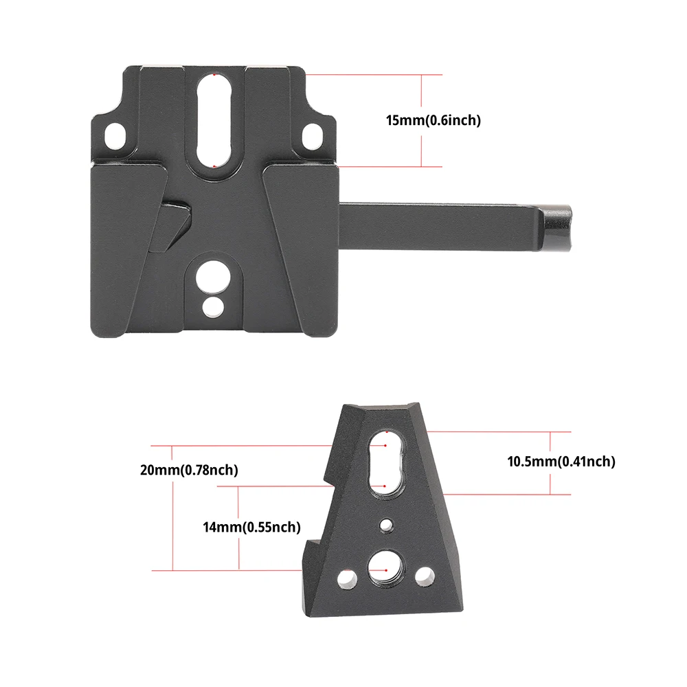 Viene con 4 tornillos M3, 2 tornillos 1/4, tamaño estándar, compatible con el clip board de batería original; Bloque triangular en forma de V con correa de expansión de 1/4 y 2 tornillos de 1/4, con un espacio de 15-20 mm entre los 2 tornillos.Para dispositivos que pesen más de 200 gramos, se necesitan 2 tornillos para la fijación.El tamaño estándar es compatible con la placa de hebilla original (no se puede instalar en la batería)