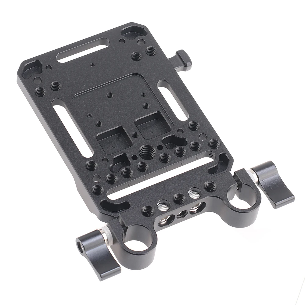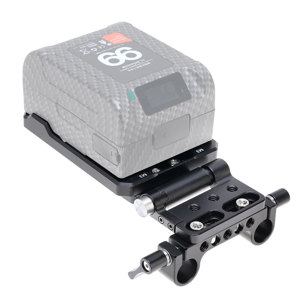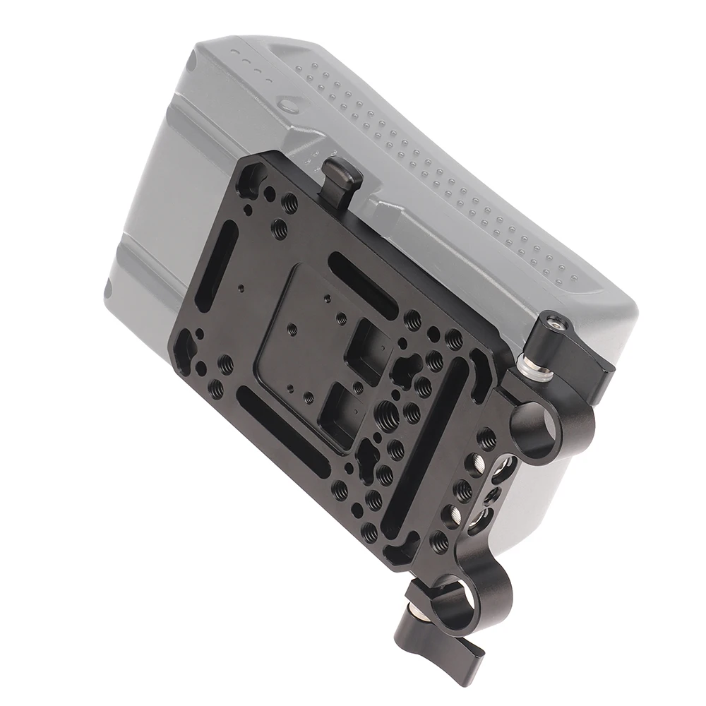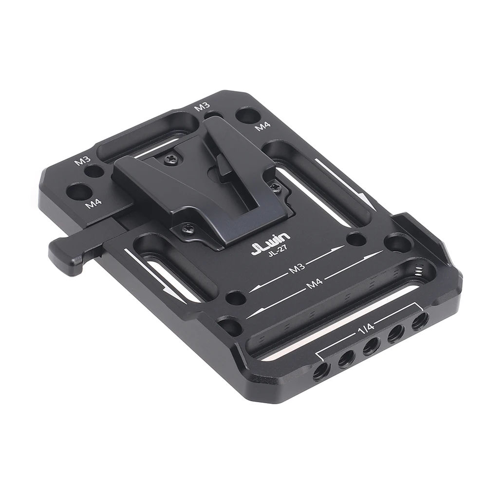 Placa de batería de montaje en V, un montaje en V estándar se adapta a la mayoría de baterías de montaje en V para proporcionar una mayor duración de la batería para su plataforma de cámara con el puerto de alimentación de la batería. La placa en sí cuenta con múltiples avellanadores de 1/4-20 ", avellanadores M3, avellanadores M4, orificios de rosca de 1/4-20", orificios de rosca M4 y un ARRI de 3/8" -16 orificios de rosca para sujetar una abrazadera de doble varilla, un brazo mágico u otros accesorios. Dos tapones evitarán que la batería se retuerza cuando esté conectada.