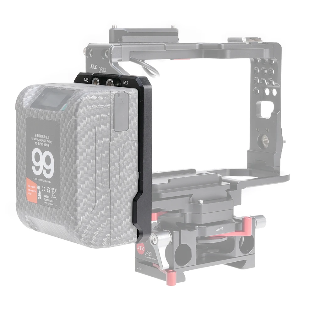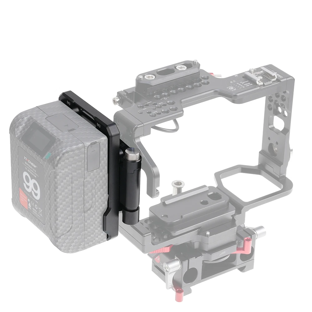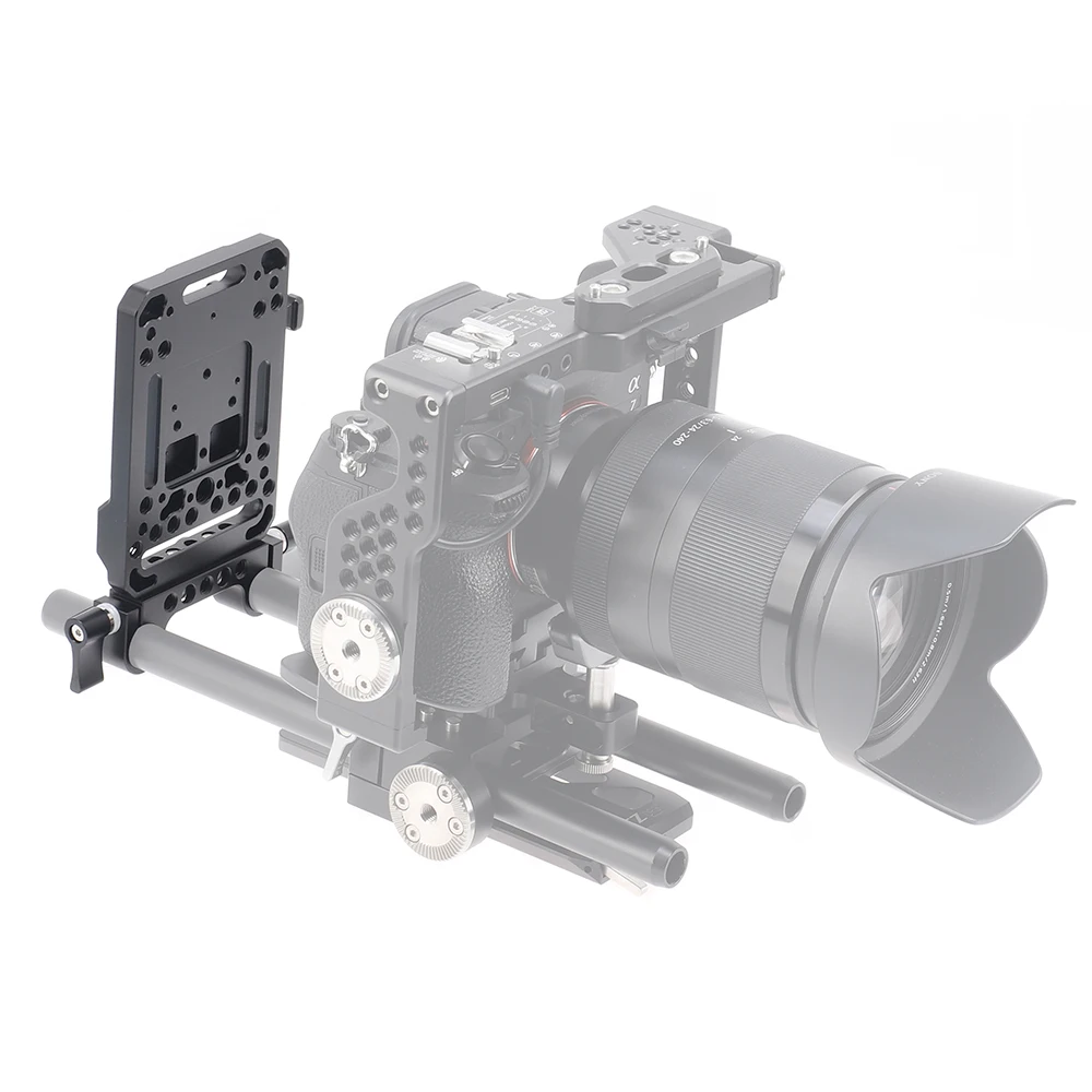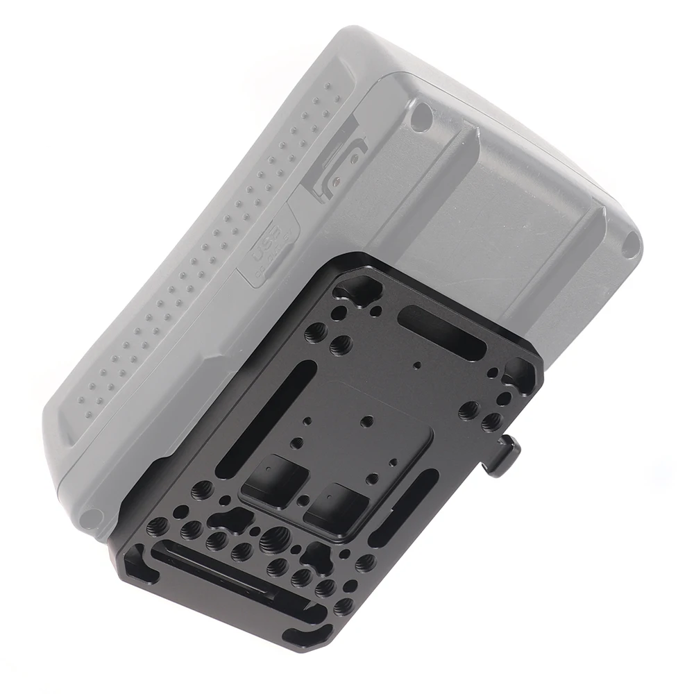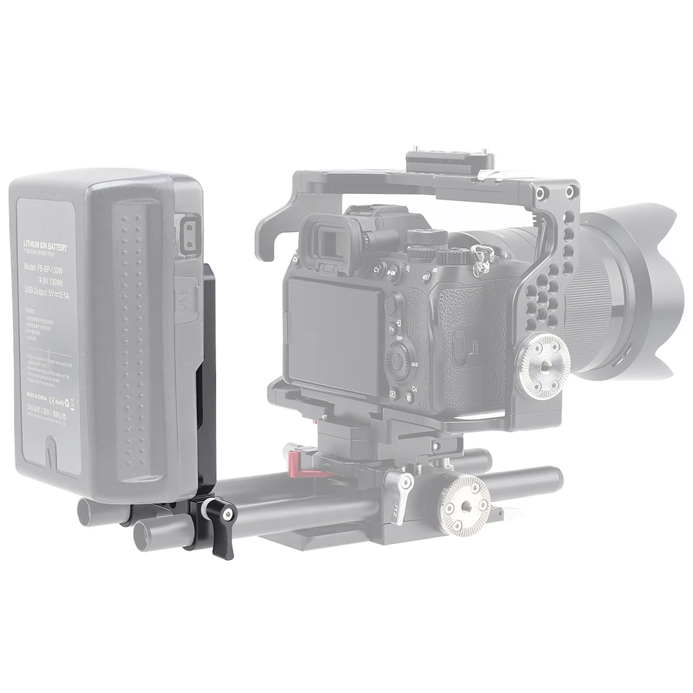 Placa de batería de montaje en V, un montaje en V estándar se adapta a la mayoría de baterías de montaje en V para proporcionar una mayor duración de la batería para su plataforma de cámara con el puerto de alimentación de la batería. La placa en sí cuenta con múltiples avellanadores de 1/4-20 ", avellanadores M3, avellanadores M4, orificios de rosca de 1/4-20", orificios de rosca M4 y un ARRI de 3/8" -16 orificios de rosca para sujetar una abrazadera de doble varilla, un brazo mágico u otros accesorios. Dos tapones evitarán que la batería se retuerza cuando esté conectada.