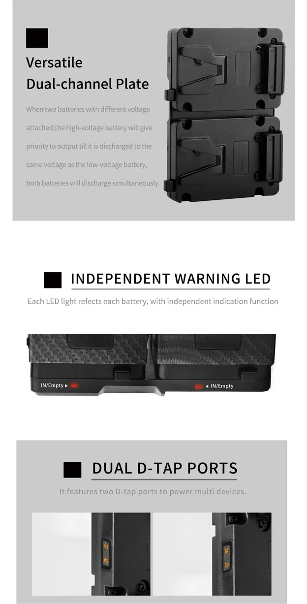 ALIMENTACIÓN SIMULTÁNEA CON DOS MINI BATERÍAS V-MOUNT LED DE ADVERTENCIA/DOBLE SALOCA/DOS PORTAS D-TAP