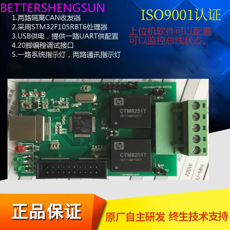 1. Esta placa de desarrollo dual CAN utiliza STMF105RBT6 de Cotex-M3 de stmicroelectronics, con un núcleo de 72MHz, periféricos ricos, USB, 2 controladores CAN, etc.