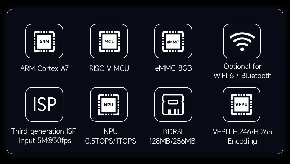 NPU de cuarta generación de desarrollo propio de Rockchip integrado, presenta una alta precisión informática y admite la cuantificación híbrida int4, int8 e int16.La potencia informática int8 de RV1106G3 es 1TOPS y RV1106G2 es 0,5TOPS