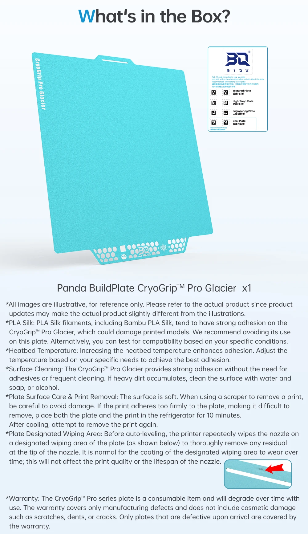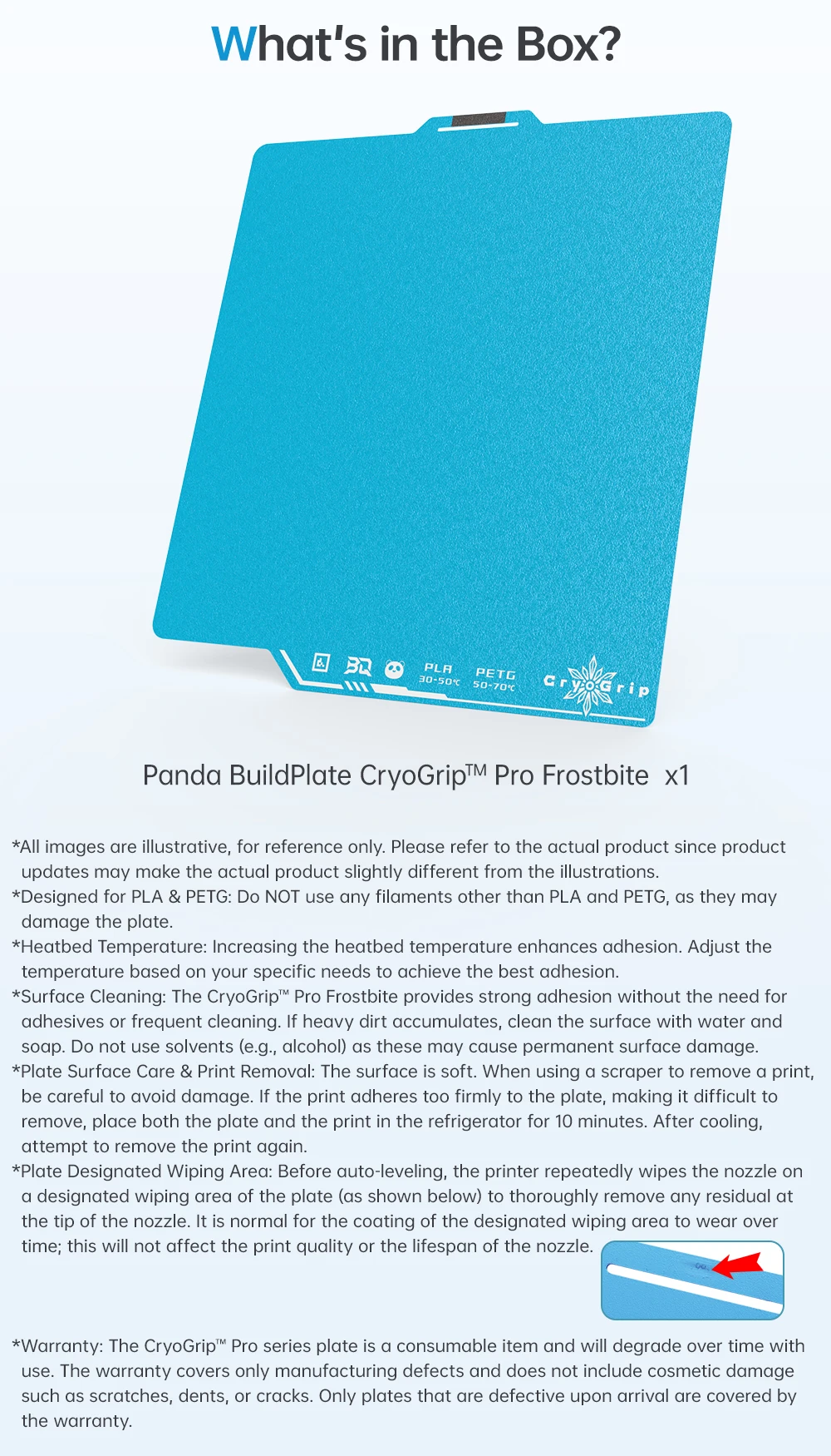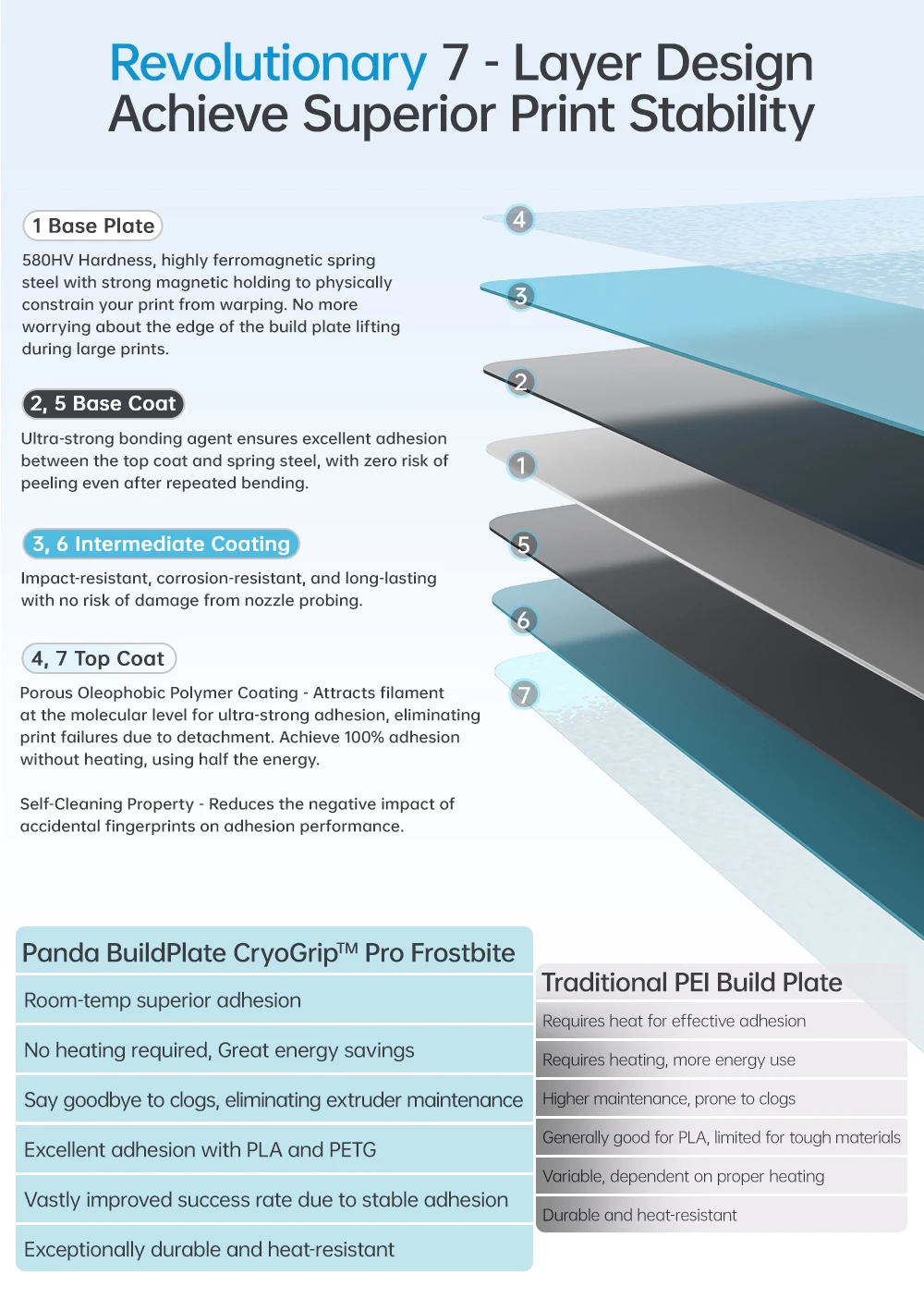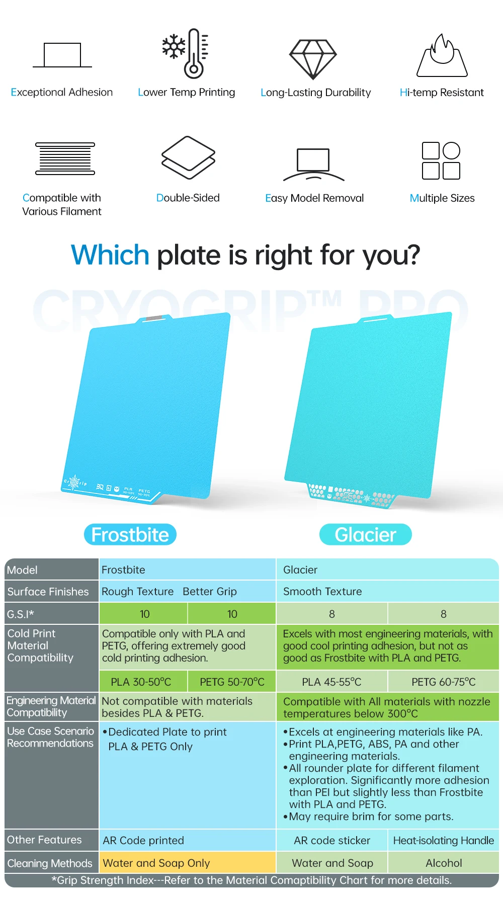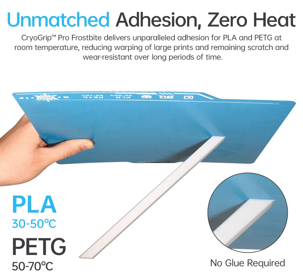 CryoGrip Pro Frostbite ofrece una adhesión incomparable para PLA y PETG a temperatura ambiente, lo que reduce la deformación de impresiones grandes y es resistente a rayones y desgaste durante largos períodos de tiempo.