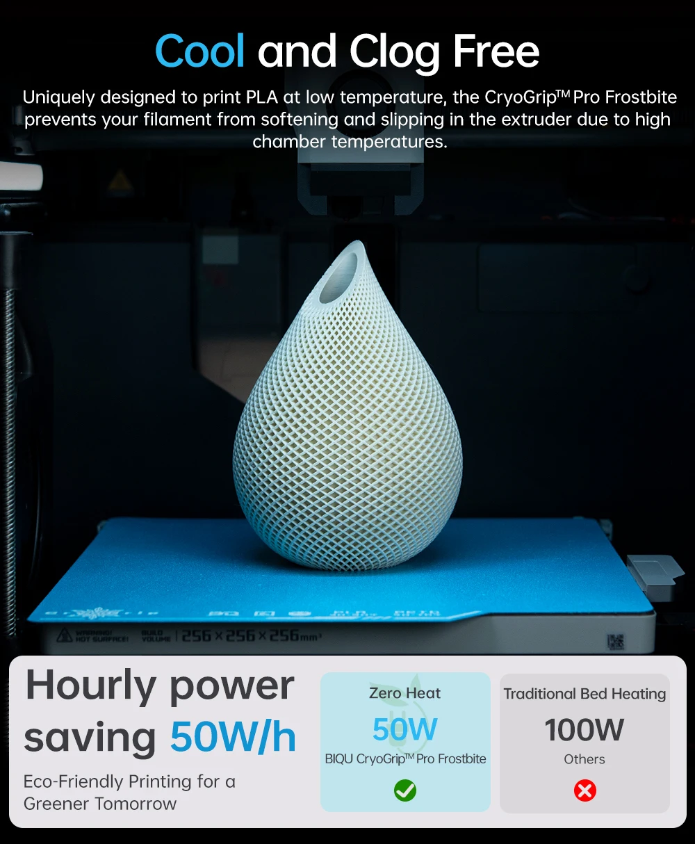 Diseñado exclusivamente para imprimir PLA a baja temperatura, CryoGrip Pro Frostbite evita que el filamento se ablande y se resbale en el extrusor debido a las altas temperaturas de la cámara.