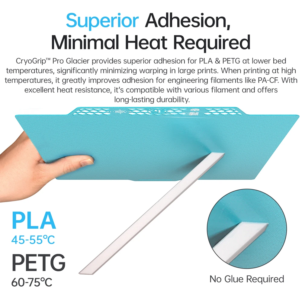 CryoGrip Pro Glacier proporciona una adhesión superior para PLA y PETG en la cama inferior