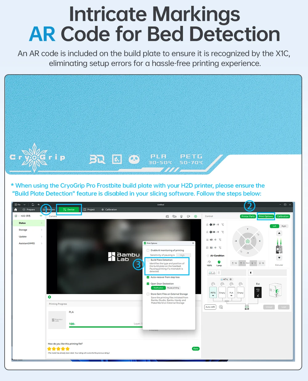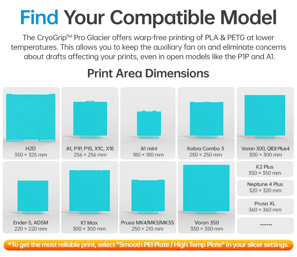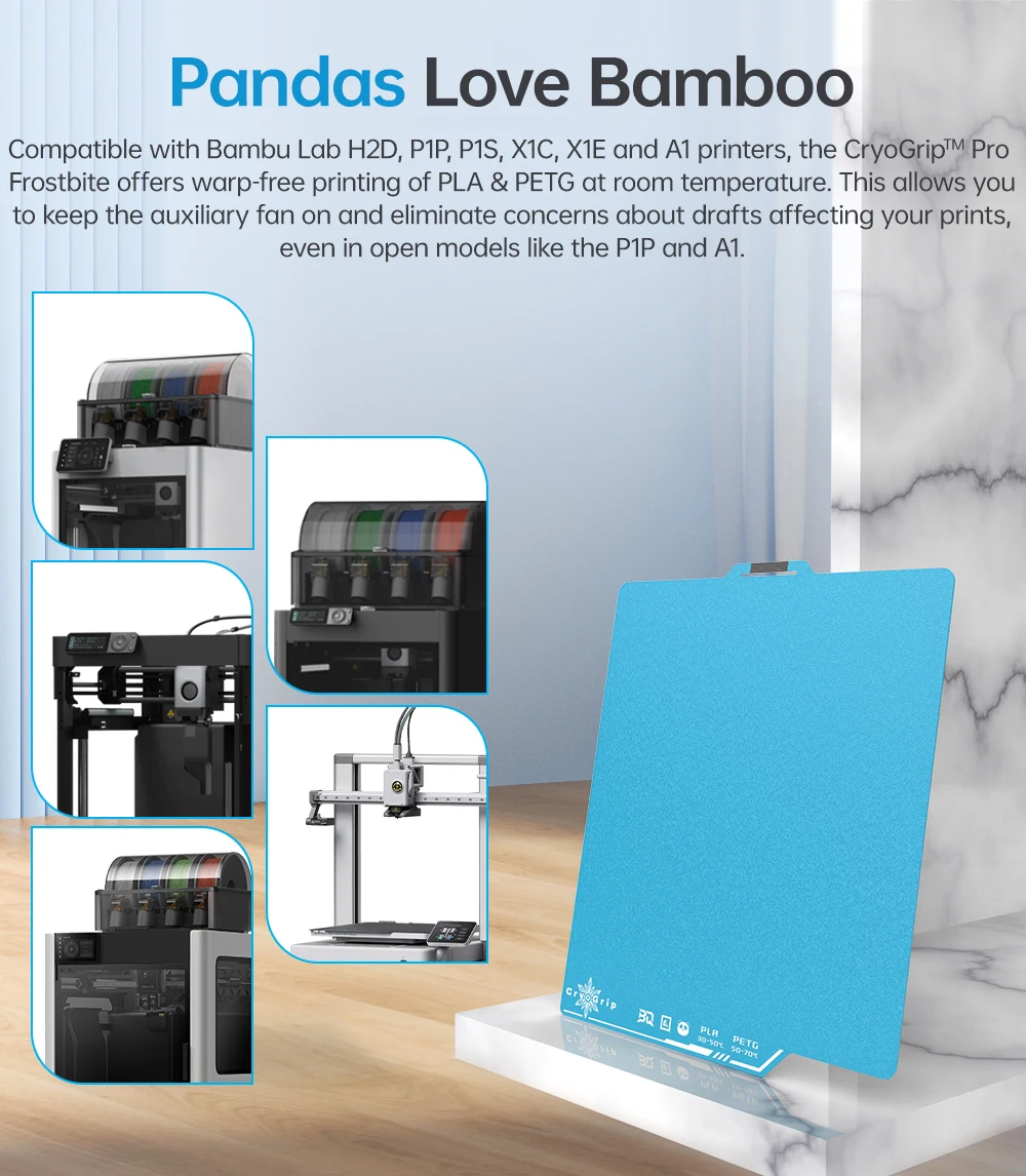 Compatible con las impresoras Bambu Lab H2D, P1P, P1S, X1C, X1E y A1, CryoGrip Pro Frostbite ofrece impresión sin deformación de PLA y PETG a temperatura ambiente.Esto le permite mantener encendido el ventilador auxiliar y eliminar la preocupación de que las corrientes de aire que afecten sus impresiones, incluso en modelos abiertos como P1P y A1.
