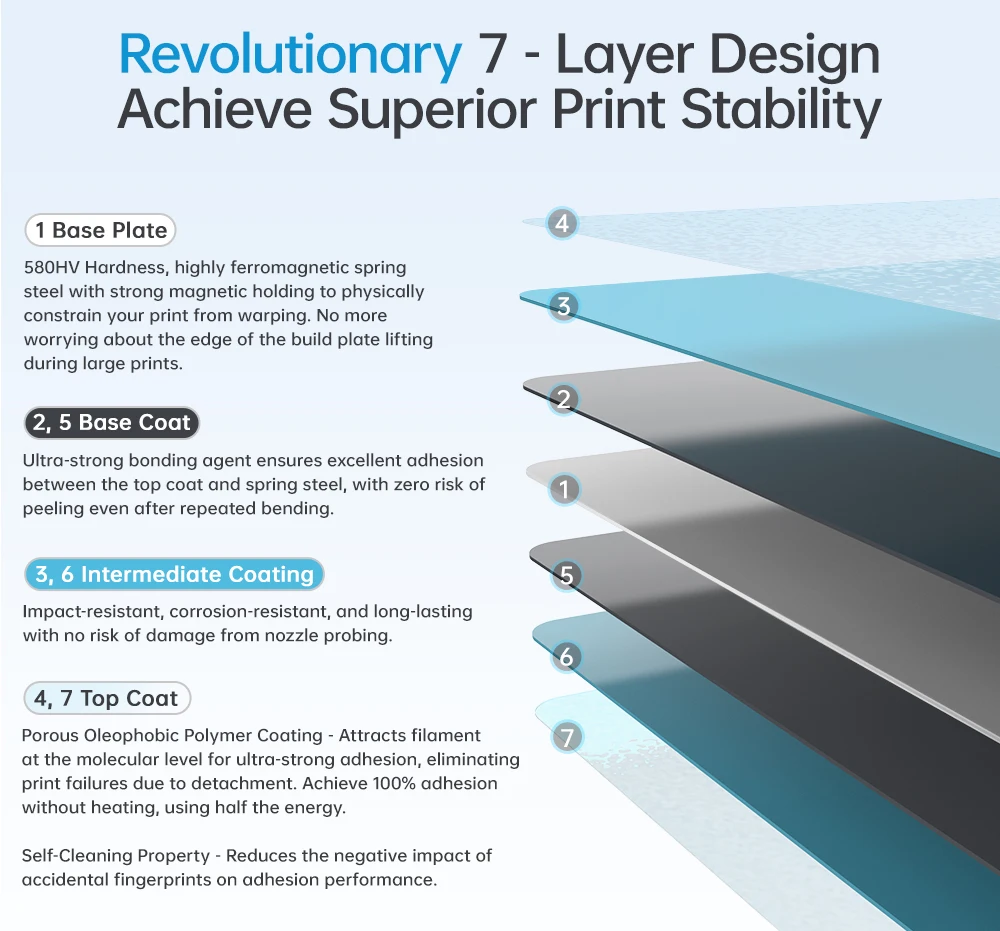 Revestimiento de polímero oleofóbico poroso: atrae el filamento en el nivel molecular para una adhesión ultrafuerte, eliminando fallas de impresión debido al desprendimiento.Logre una adhesión del 100% sin calentar, utilizando la mitad de la energía.