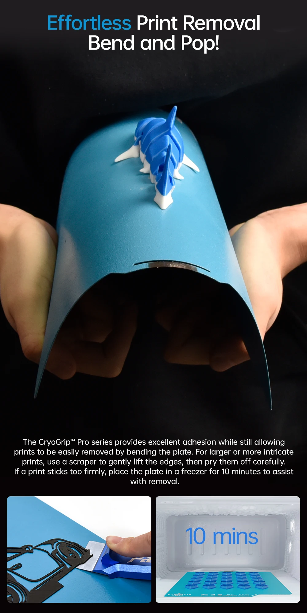 La serie CryoGrip Pro pro proporciona una excelente adherencia y al mismo tiempo permite eliminar fácilmente las impresiones doblando la placa.Para impresiones más grandes o más complejas, utilice un