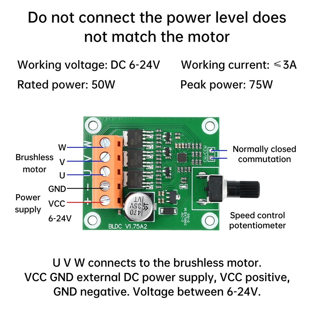 1. Optional 75W or 200W high power output, suitable for a variety of specifications brushless motor applications.2. Wide range of input voltage (6-24V), strong compatibility, to meet diversified needs.3. Built-in intelligent speed control function, precise control of speed, smooth and quiet operation.4. High-efficiency drive circuit design, low energy consumption, superior heat dissipation performance, long service life.5. Optimized for optical drives, hard disk fans and other scenarios, fast startup, strong load capacityParameter:
