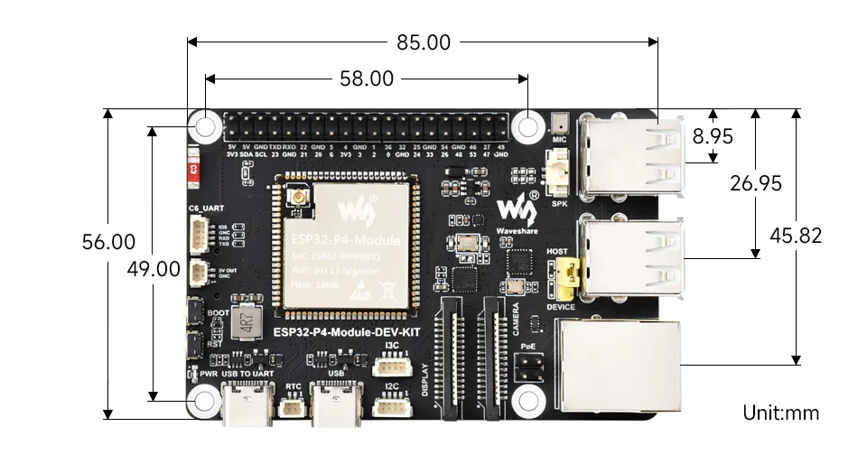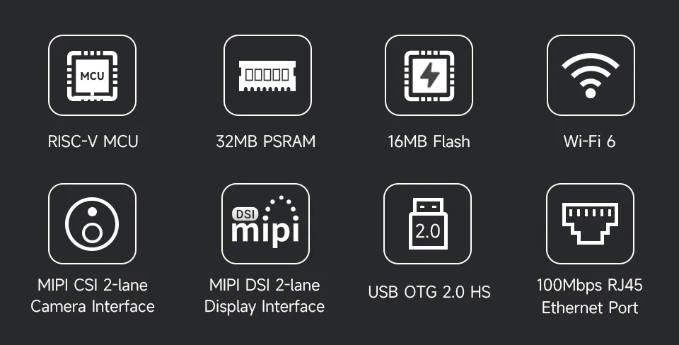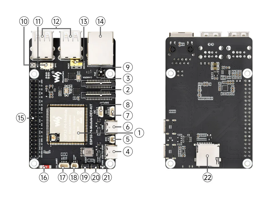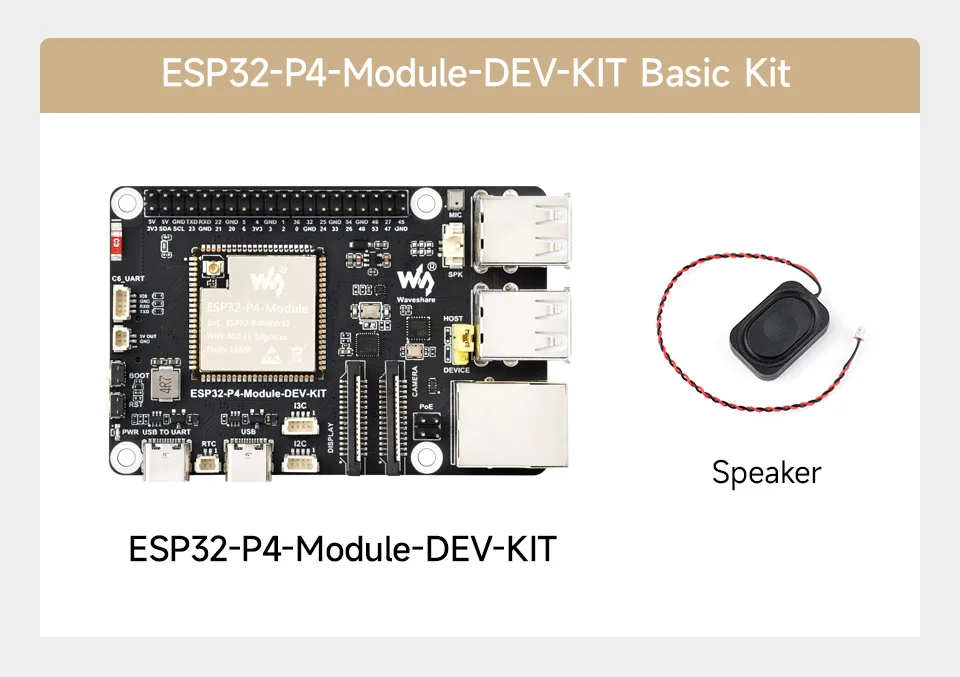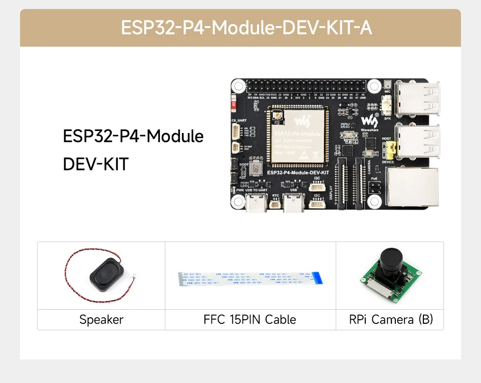 Este producto es una placa de desarrollo multimedia basada en ESP32-P4 con ESP32-C6 integrado, compatible con conexión inalámbrica Wi-Fi 6 y Bluetooth 5.Cuenta con ricas interfaces hombre-máquina, que incluyen MIPI-CSI (con procesador de señal de imagen integrado), MIPI-DSI, SPI, I2S, I2C, LED PWM, MCPWM, RMT, ADC, UART, TWAI, etc.Además, admite USB OTG 2.0 HS, puerto Ethernet RJ45 integrado con conector de función PoE reservado y conector GPIO de 40 pines integrado que es compatible con algunos Raspberry Pi HAT, lo que permite una gama más amplia de adaptabilidad de aplicaciones.