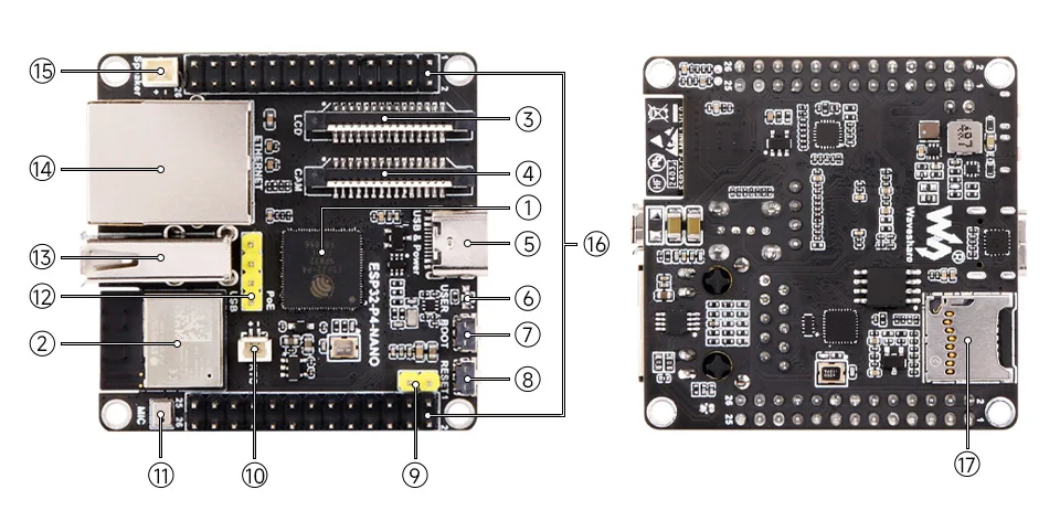 Este producto es una placa de desarrollo de alto rendimiento basada en el chip ESP32-P4 con procesadores de doble núcleo y de un solo núcleo RISC-V, y presenta ricas interfaces Human-Machine, que incluyen MIPI-CSI (con procesador de señal de imagen integrado) y Interfaz MIPI-DSI.Admite una amplia gama de periféricos de uso común, incluidos SPI, I2S, I2C, LED PWM, MCPWM, RMT, ADC, UART y TWAI.Además, ofrece soporte para USB OTG 2.0 HS, Ethernet y SDIO Host 3.0, lo que facilita la conectividad de alta velocidad.