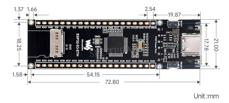 This is an Ethernet development board designed based on ESP32-S3R8. It has excellent Wi-Fi and Bluetooth wireless connection functions, more reliable and efficient wired Ethernet connection, and supports PoE power supply (PoE version only). The onboard camera interface is compatible with mainstream cameras such as OV2640 and OV5640, which facilitates image and video acquisition. The development board also reserves a Pico compatible interface to support some Raspberry Pi Pico expansion boards. Relying on its rich ecology and open source resources, users can quickly and flexibly carry out secondary development. It can be widely used in Internet of Things, image acquisition, smart home and artificial intelligence projects.