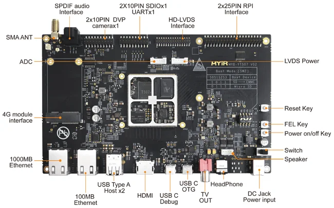MYIR proporcionapara evaluar el módulo de CPU MYC-YT507H.Se necesitan todas las ventajas de la MPU Allwinner T5 para explorar un rico conjunto de periféricos e interfaces en la placa base, incluidaPuertos serie, un Gigabit Ethernet y un 10/100 M bps Ethernet, dos USB 2.0 HOST y un USB 2.0 OTG, una ranura para tarjeta TF y una interfaz Mini PCIE 4G basada en USB.Tiene una interfaz de cámara DVP y una interfaz MIPI-CSIpara permitir la conexión con módulos de cámara.También admite interfaces de salida de vídeo múltiples, comoSALIDA dual LVDS, HDMI y CVBS, para lograr una visualización diferente en pantallas duales.